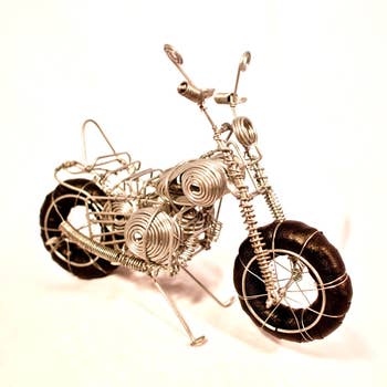 Cette moto d'inspiration classique est fabriquée par Armando Ramirez à partir d'une collection intrigante de pièces en métal recyclé, certaines extraites de voitures. Les pneus sont des roulements du système électrique d'une voiture et les enjoliveurs sont des bobines électriques. Le réservoir de carburant de la moto était autrefois un culbuteur provenant d'un allumage automobile. Le moteur est formé d'une roue dentée ainsi que d'une chaîne de distribution. <br><br>Veuillez noter que l'artiste n'a pas l'intention de donner à ses sculptures une finition polie fine, par conséquent, des taches et des rayures peuvent être présentes.