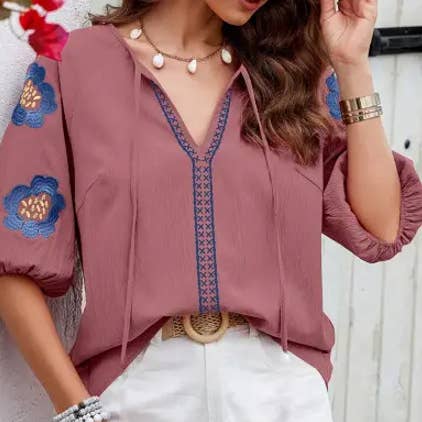 CWTBLS1117_TOP BOHÈME DÉCONTRACTÉ À MANCHES COURTES ET COL EN V EN VENTE B2B