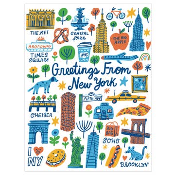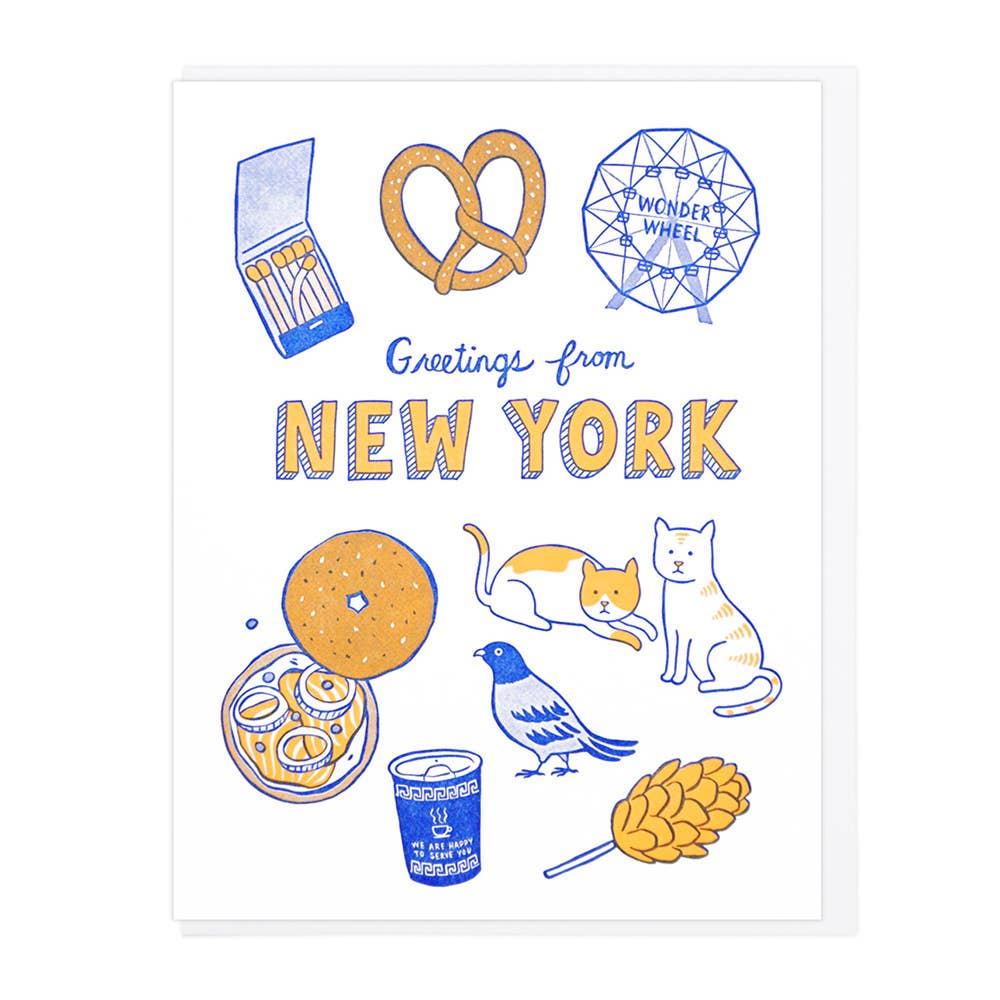 Envoyez des salutations de NYC avec certains des sites et collations préférés de l'arrondissement. Imprimé sur du papier 100 % recyclé et accompagné d'une enveloppe assortie. Intérieur vierge et scellé dans une pochette en cellophane protectrice. Taille A2 (10,8 cm x 14 cm). La carte indique "Hello From NYC" et présente des illustrations d'un pigeon, d'une pizza, de l'Empire State Building, d'un bagel, d'une tasse de café, et plus encore.