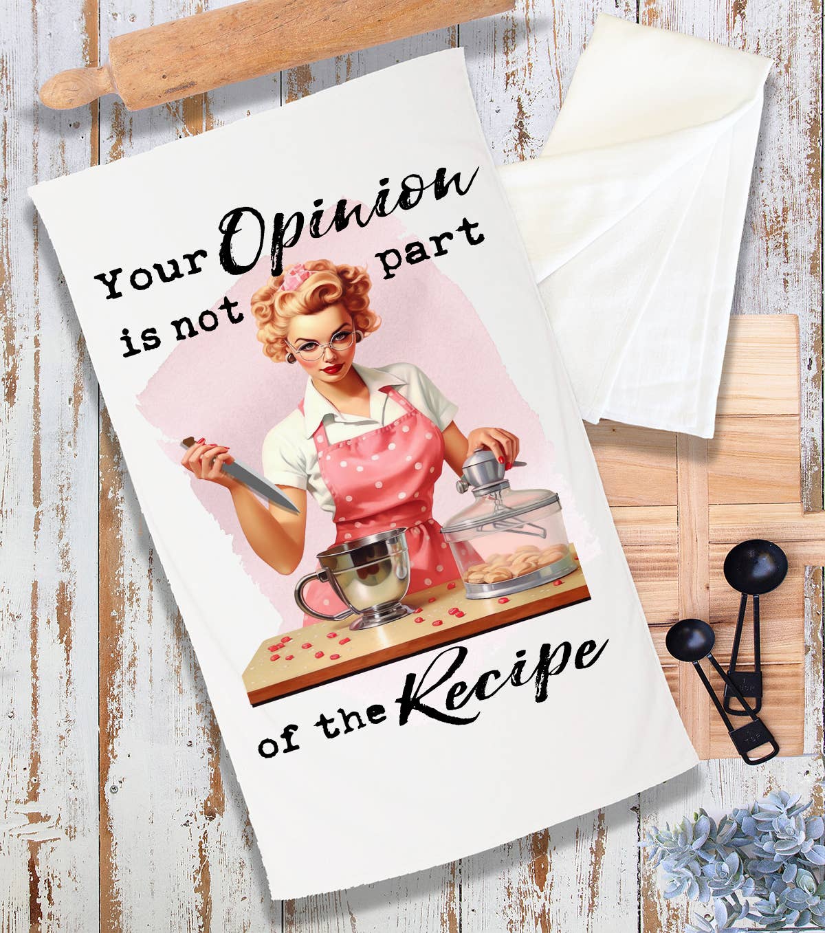 Le torchon Your Opinion est un torchon en coton blanc avec une boucle en tissu dans un coin pour l'accrocher facilement aux crochets et aux boutons. La serviette porte l'inscription « votre opinion ne fait pas partie de la recette » en lettres noires et mesure 28 pouces x 28 pouces.