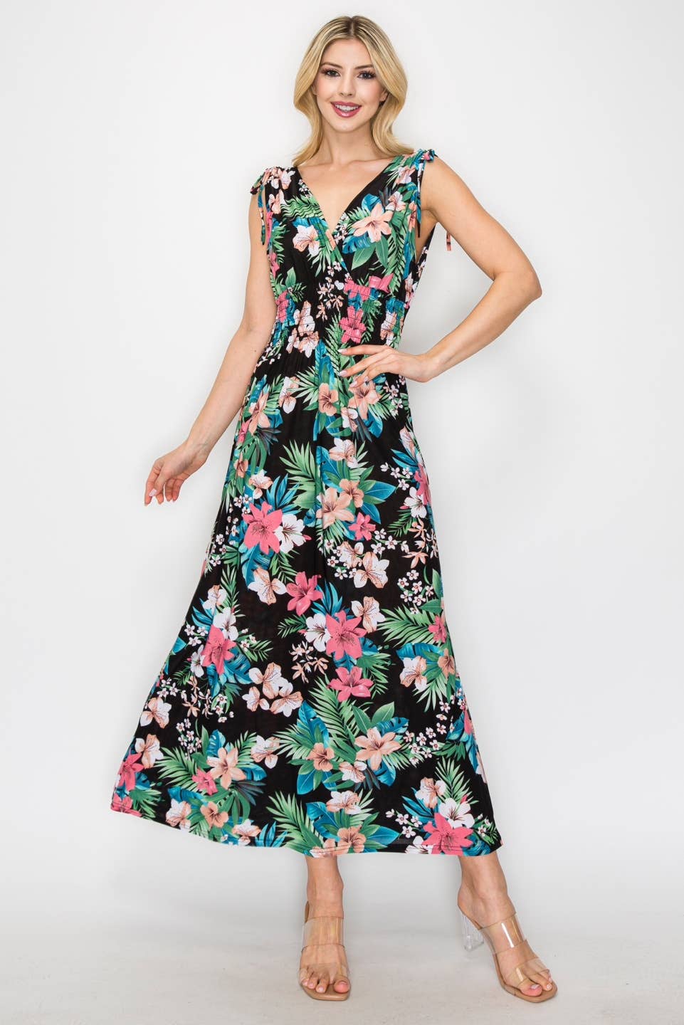 Robe mi-longue à imprimé floral fabriquée aux États-Unis avec détail smocké au dos en vente B2B