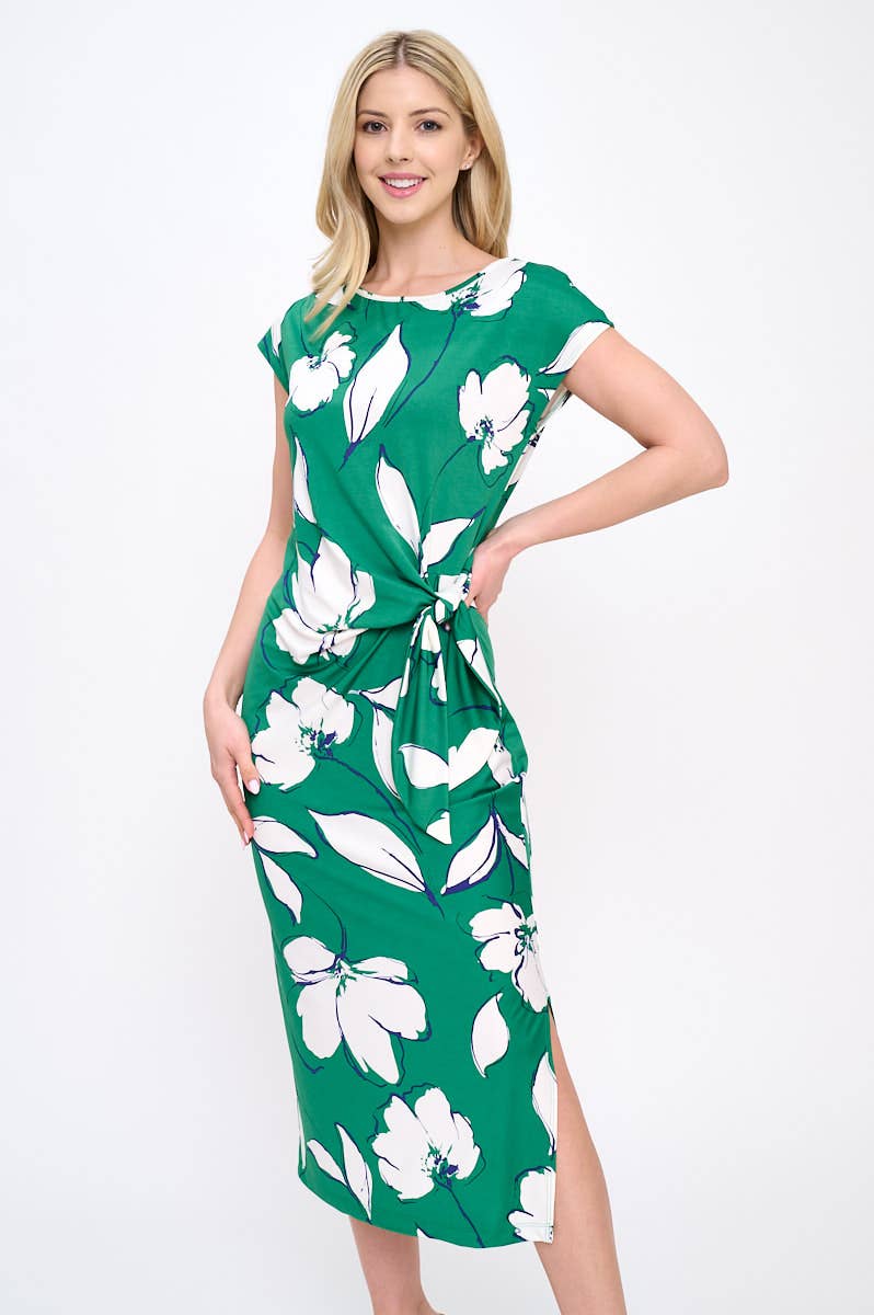 Fabriqué aux États-Unis Robe midi à imprimé floral avec détail smocké au dos et poches. Disponible en d'autres couleurs. Composition du tissu : 80 % rayonne, 20 % nylon.