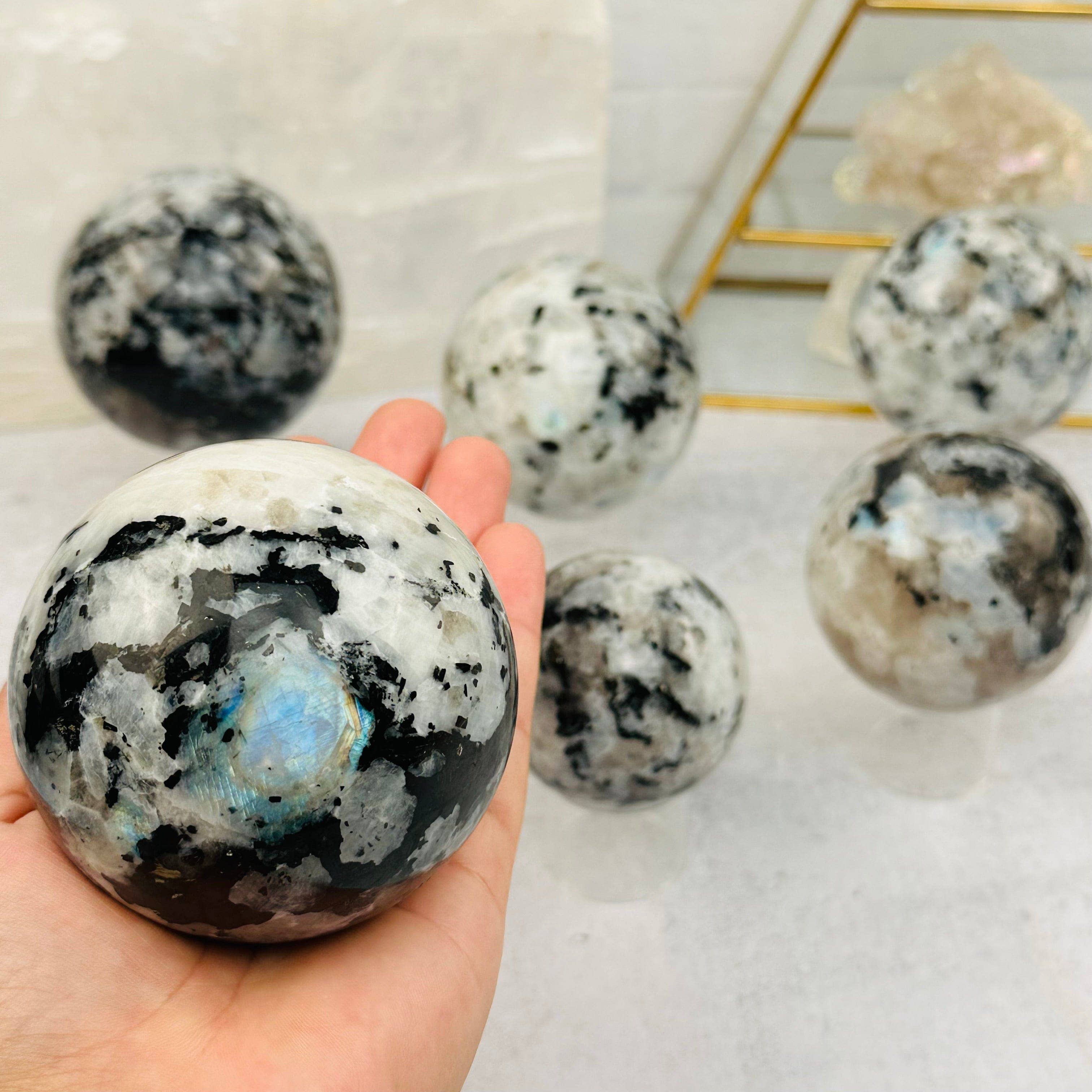 Ensemble de 4 pièces de sphères en agate volcanique réactive aux UV avec baguette et lune G719 C'est l'ensemble exact que vous recevrez Livré avec UNE (1) carte de signification de cristal Sphère 2,1" et 2,3" Lune 4,1" Baguette 7 1/4"