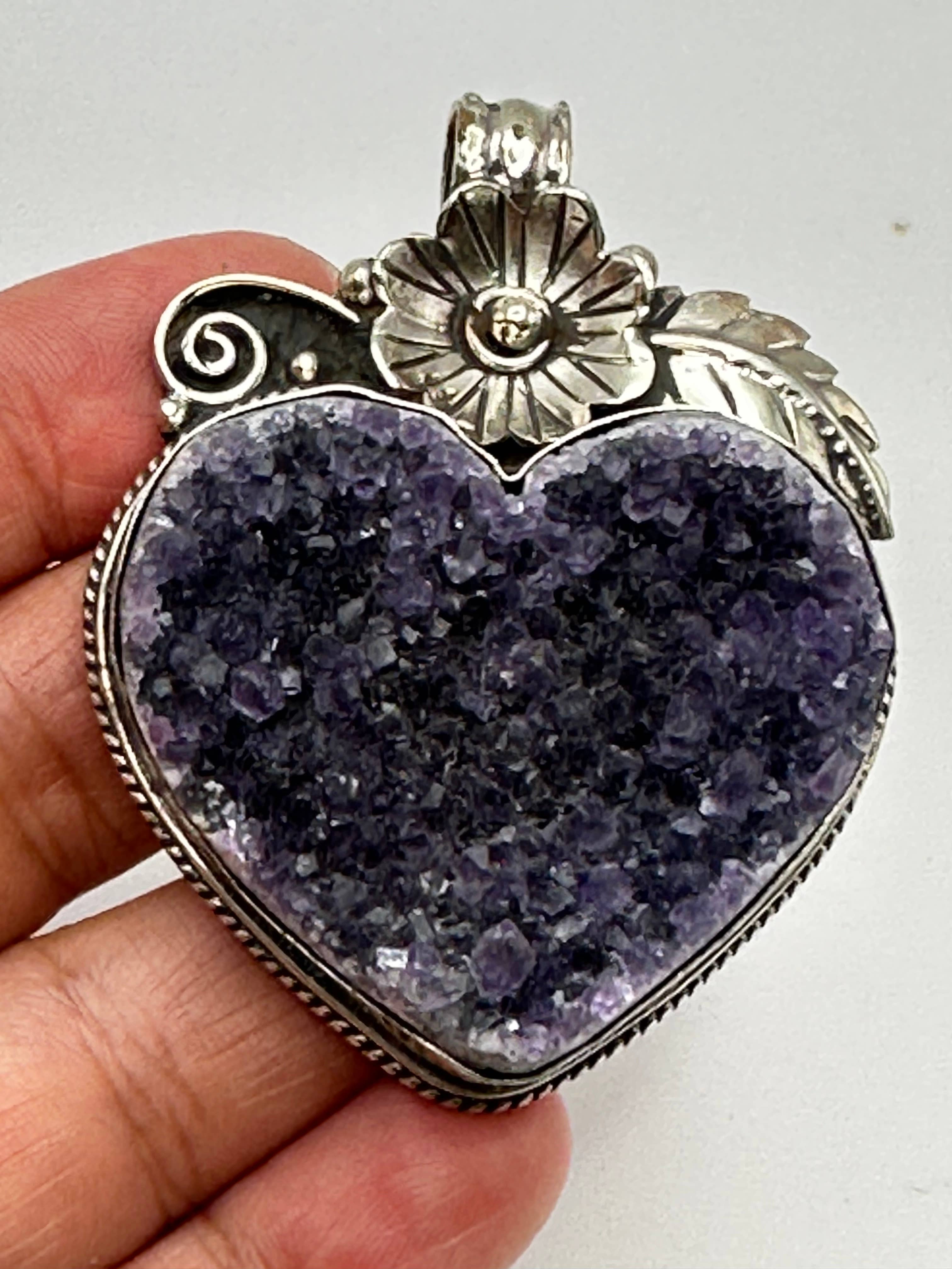 Ce petit pendentif lune Druzy en améthyste de 0,5 pouce (1,27 cm) monté en argent sterling est un ajout magnifique à votre collection de pendentifs. L'améthyste stimule la conscience spirituelle et l'intuition. Elle aide à éloigner les émotions négatives en attirant l'énergie positive.