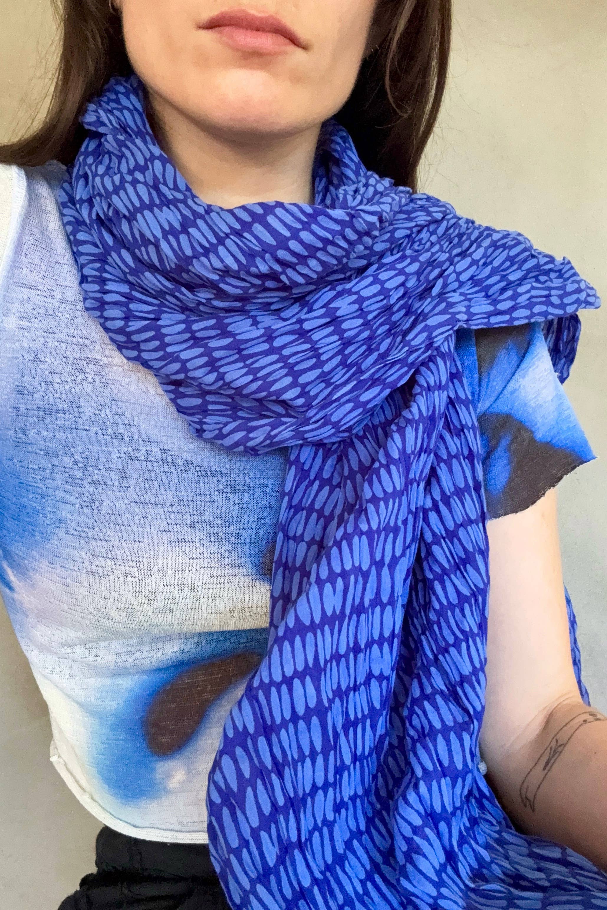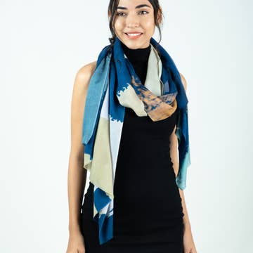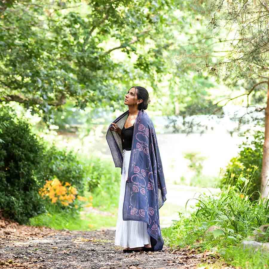 Cette grande écharpe bleue imprimée au bloc s'inspire d'un jardin de lotus. Un mélange d'impression avec fer et résistance à la boue a créé ce magnifique jardin d'amour. Le lotus symbolise la croissance. On dit que vivre comme un lotus, c'est vivre avec beauté, éveil et sérénité, indifférent à l'eau sale qui l'entoure. - Impression au bloc réalisée à la main avec des blocs de bois gravés - Teinture manuelle avec des colorants naturels - Couleur : bleu - Tissu : 25 % soie, 75 % coton - Dimensions : 86 cm x 198 cm ENTRETIEN : Lavage à la main ou en machine cycle délicat à froid pour les premiers lavages. Séchage à plat. Repassage si nécessaire.