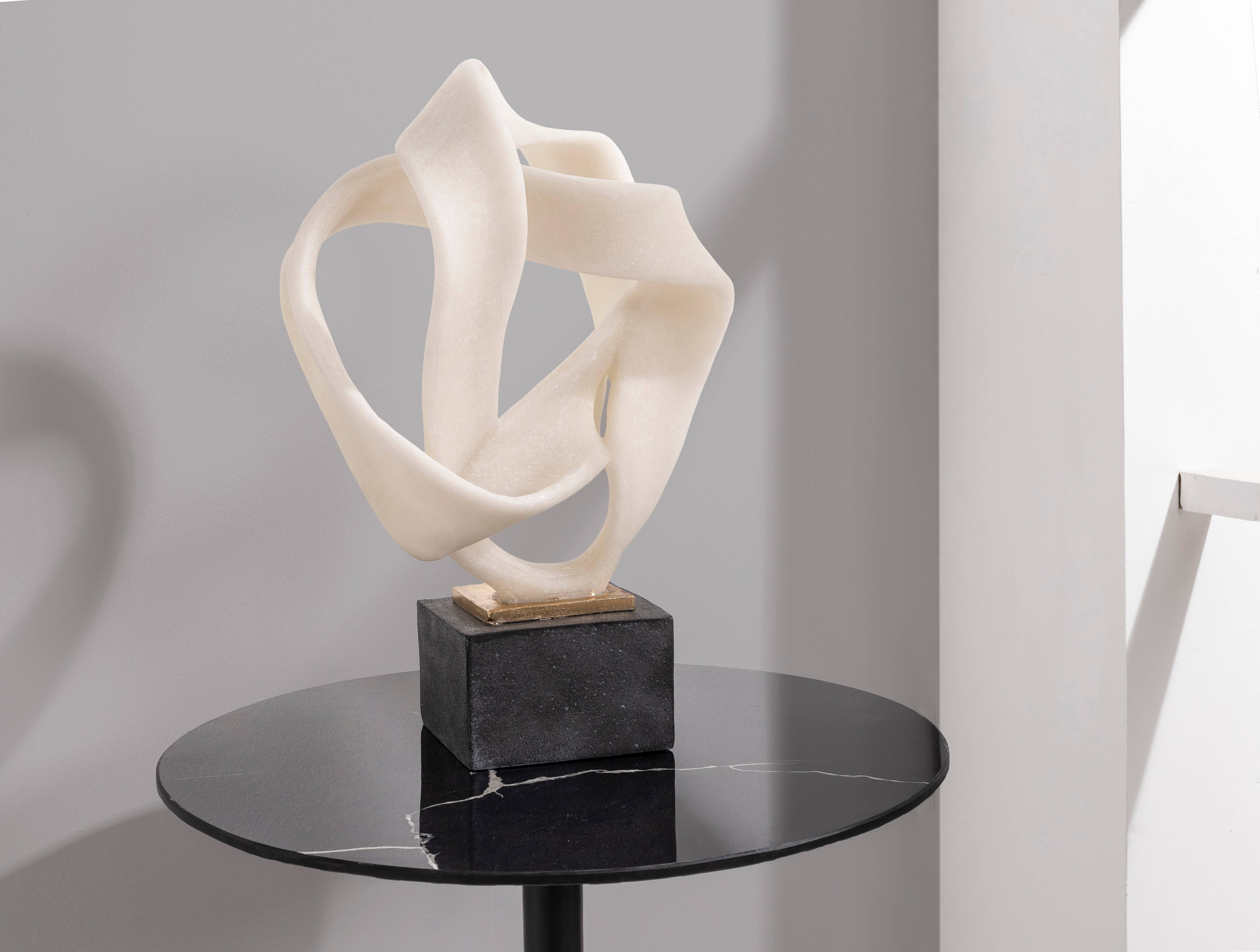 Sculpture en polyrésine, laquée dorée, base blanche, Dimensions : 22 x 49 x 22 cm. Base effet marbre noir. Sculpture à effet métallique doré aux formes enchevêtrées Nous vous recommandons de le nettoyer avec un chiffon humide, en évitant l'utilisation de produits chimiques.