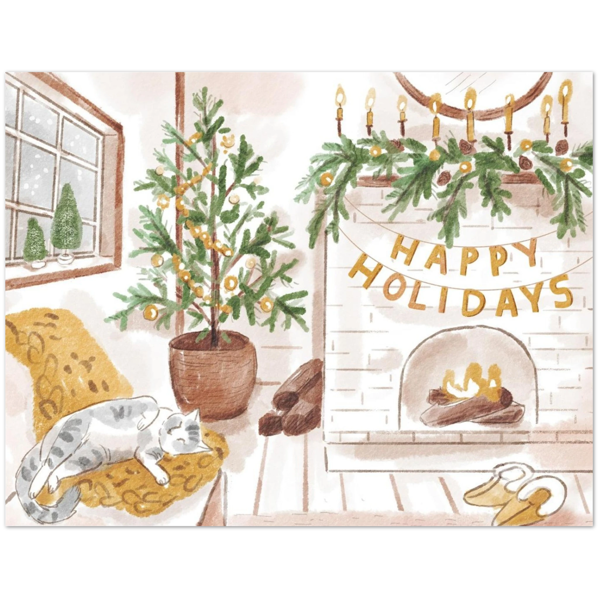 Faites plaisir aux amoureux des chats avec cette carte de vœux représentant un chat douillet dormant sur une pile de cadeaux à côté d'un sapin de Noël. Son design chaleureux et ludique et ses couleurs vives le rendent parfait pour répandre la joie des Fêtes avec une touche de charme félin. 🧾 SPÉCIFICATIONS D'IMPRESSION - Imprimé avec des encres d'archivage de haute qualité sur du papier mat Ultra Premium de 100 livres - Taille : 5,25 x 5,25 pouces plié (10,5 x 5,25 pouces à plat) - Livré avec une enveloppe blanche, dans une pochette transparente - Préplié, intérieur vierge - Les couleurs réelles peuvent différer des couleurs de votre écran en raison des différences d'éclairage, de la résolution de l'écran et des paramètres personnels