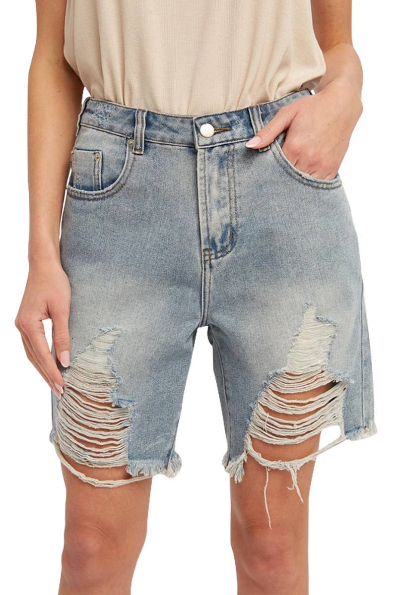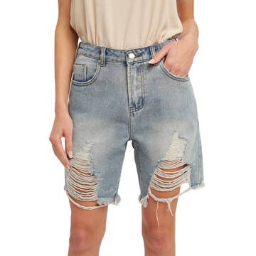 Short en denim Judy Blue taille mi-haute avec contrôle du ventre, délavage vintage et ourlet effiloché. en vente B2B