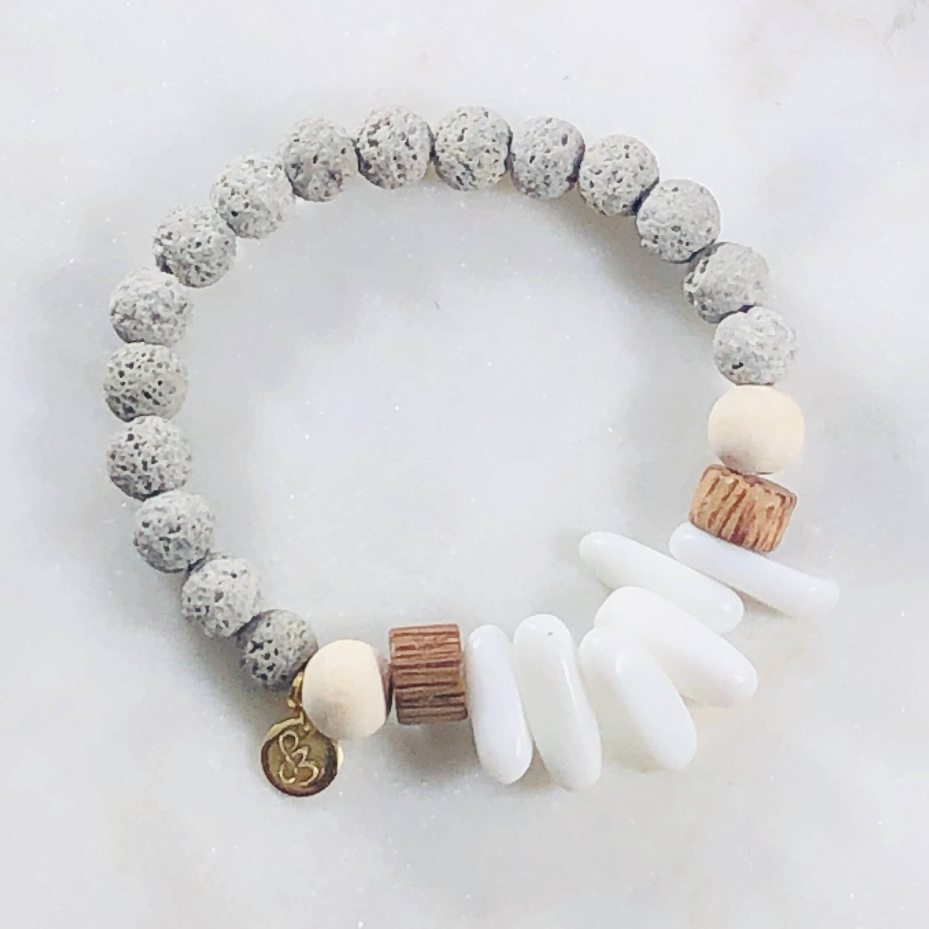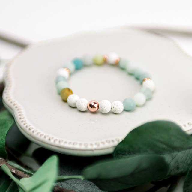 Le Harper est conçu avec de la pierre d'amazonite naturelle et des perles diffusantes en bois de rose brut. Les pierres mesurent 8 mm et peuvent être empilées avec d'autres modèles ou portées seules. Chaque modèle est fabriqué avec un cordon extensible de 1 mm qui donne de la résistance et permet l'étirement. Ajoutez simplement 1 à 2 gouttes d'huile essentielle aux perles du diffuseur en bois de rose brut pour profiter des bienfaits aromatiques tout au long de la journée. Réappliquez si nécessaire. Chaque modèle est étiqueté individuellement pour permettre au détaillant de fixer le prix.