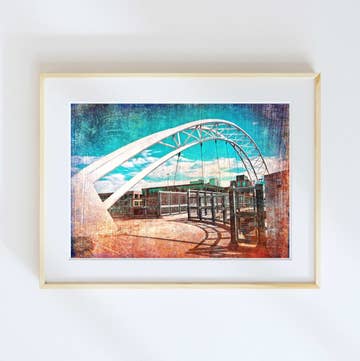 Cette impression présente la peinture "Promenade dans un Pays des Merveilles Yinzer", une représentation fantaisiste de Pittsburgh inspirée par la célébration annuelle de la Nuit d'Illumination de la ville et le village de Noël en céramique de la mère de l'artiste. L'impression mesure 5"x7" et est fixée sur un passe-partout blanc biseauté de 8"x10" avec un carton de fond. Signée individuellement par l'artiste.
