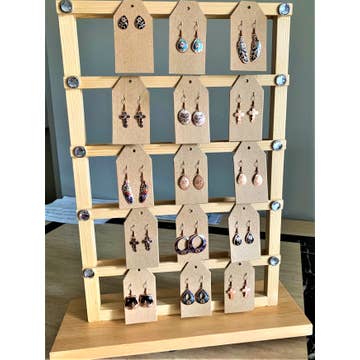 Présentoir à boucles d’oreilles de comptoir en bois. Peut contenir 30 styles différents de boucles d’oreilles, avec jusqu’à 4 boucles par tige, soit un total de 120 boucles d’oreilles exposées. Dimensions : 42,7 cm de large x 40,6 cm de haut (55,9 cm avec le panneau ardoise) x 20,3 cm de profondeur. Disponible en plusieurs couleurs.