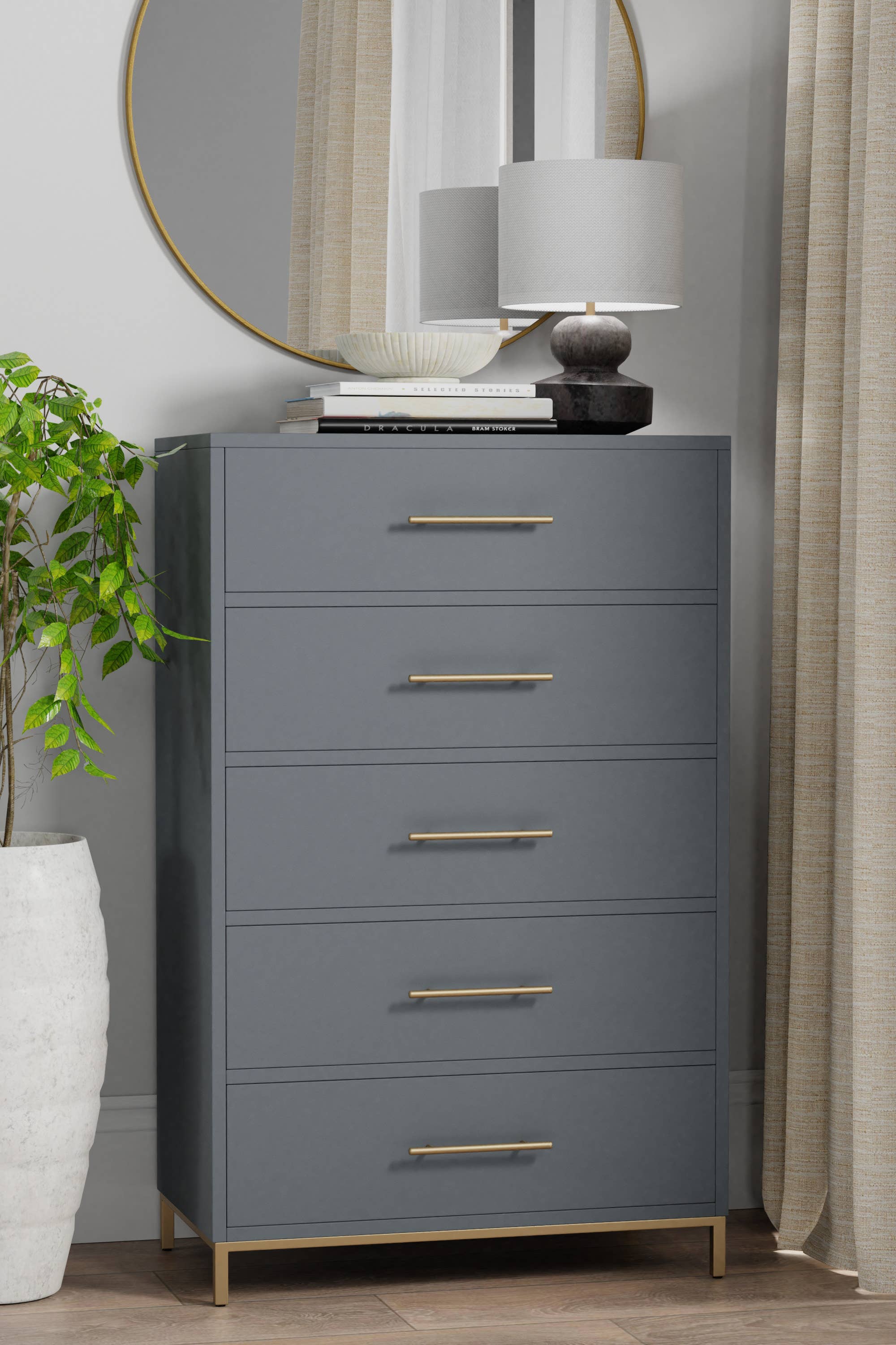 La combinaison de la commode asymétrique Pearl et du miroir paysager est un choix élégant et pratique pour toute maison. Avec son design transitionnel, elle s'intègre parfaitement à une variété de styles de décoration. Fabriquée à partir de matériaux de qualité tels que le bois de caoutchouc, le mindi et les placages de chêne blanc, cette commode promet durabilité et élégance. La finition Soft Sand met en valeur sa beauté naturelle, en faisant une pièce maîtresse dans n'importe quelle pièce. La commode offre un grand espace de rangement avec quatre tiroirs et une porte, dotés d'une construction à queues d'aronde anglaises et de glissières métalliques à extension complète. Ces éléments garantissent une utilisation durable et un accès facile aux objets rangés. Les fonds de tiroirs en placage teintés et scellés protègent vos vêtements, tandis que les poignées de tiroir en nickel brossé et les pieds effilés ajoutent une touche de charme côtier.