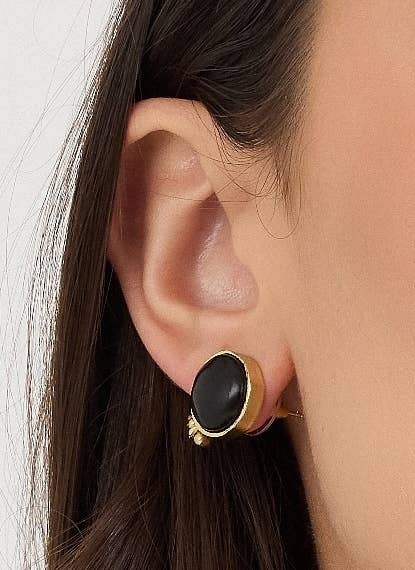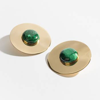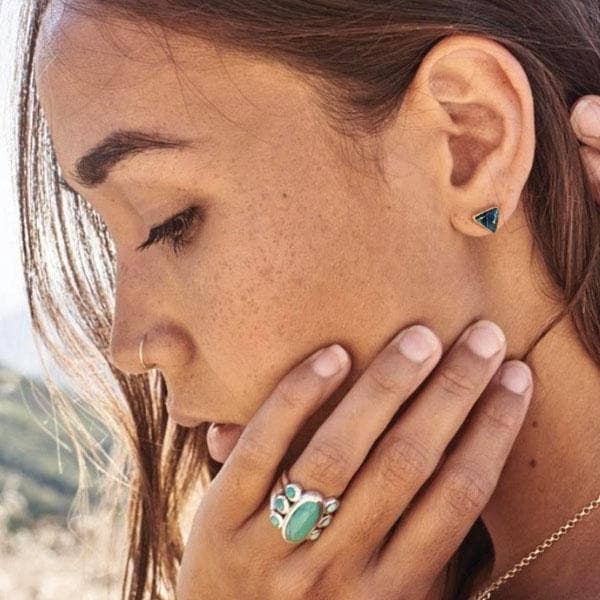 Laiton massif avec véritables pièces de turquoise de 8 mm sur des clous en argent sterling. Disponible en laiton poli massif ou avec notre plaquage or 24K à haute déposition. Le modèle porte ces boucles d'oreilles en laiton. La finition en laiton a des nuances plus jaunes, tandis que le plaquage or 24K est d'une couleur or plus profonde et rosée, et résiste au ternissement.