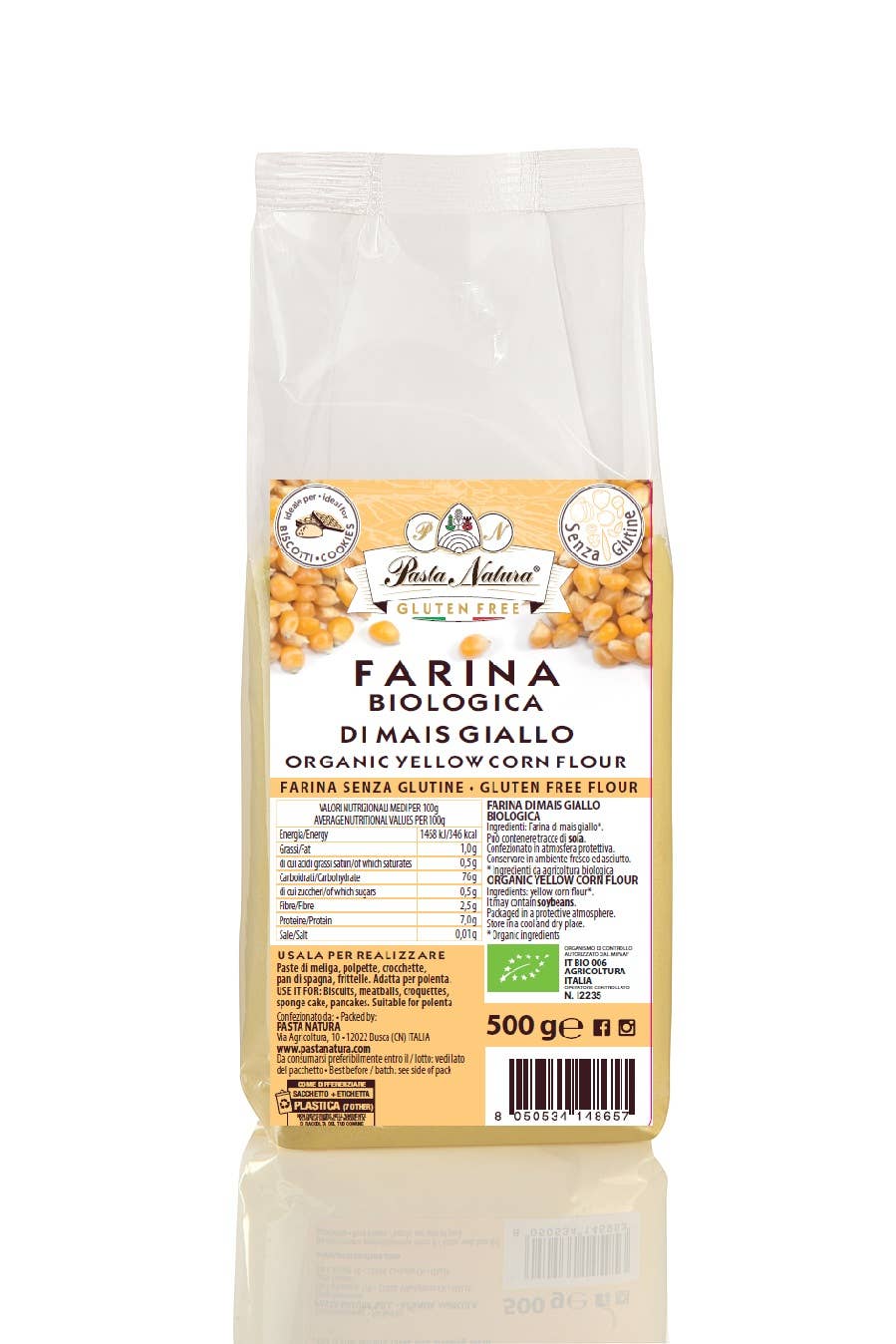 Farine de maïs jaune bio et sans gluten. Format disponible : 500 g Ingrédients 100 % naturels. Emballage écologique 100 % recyclable. Fabriqué en Italie.