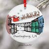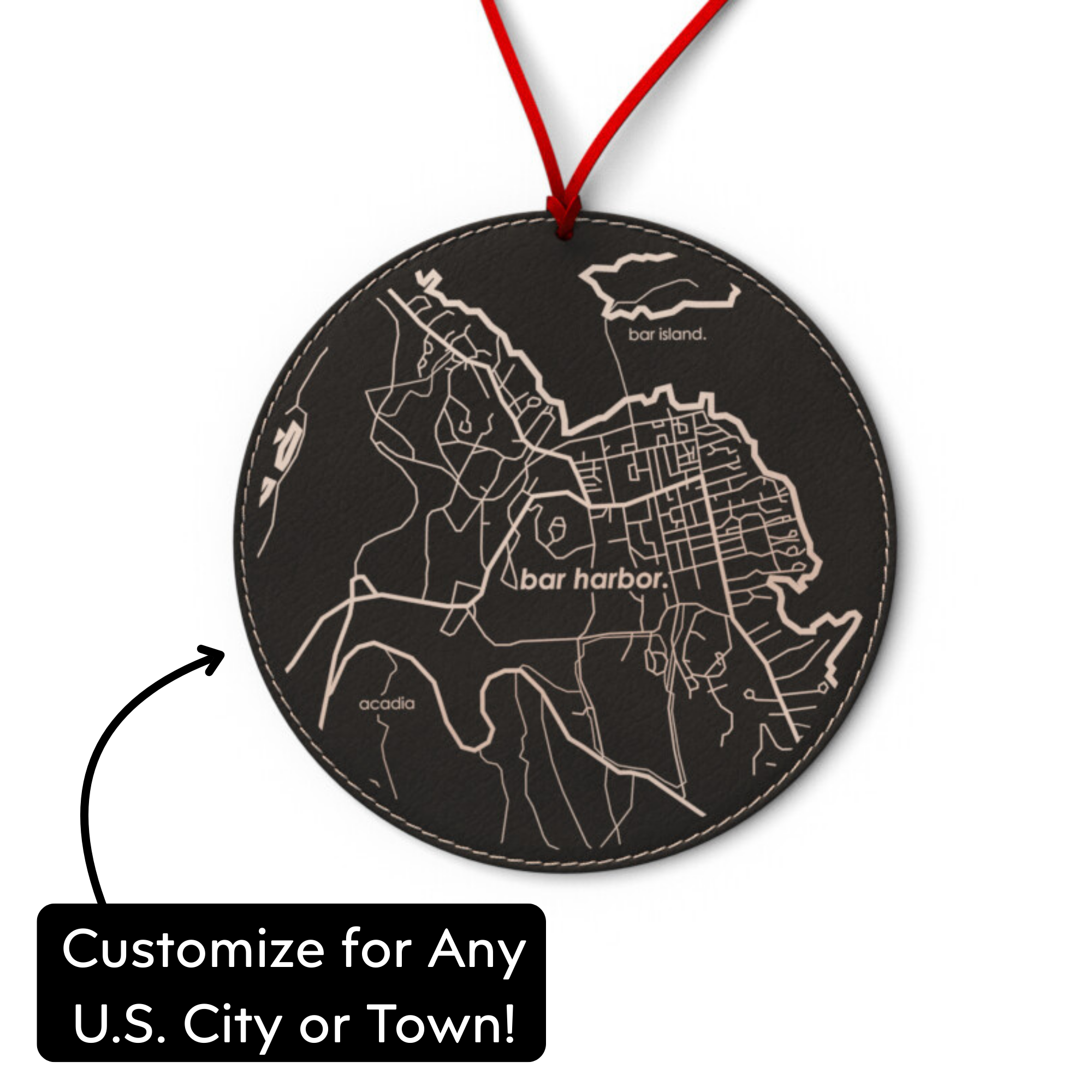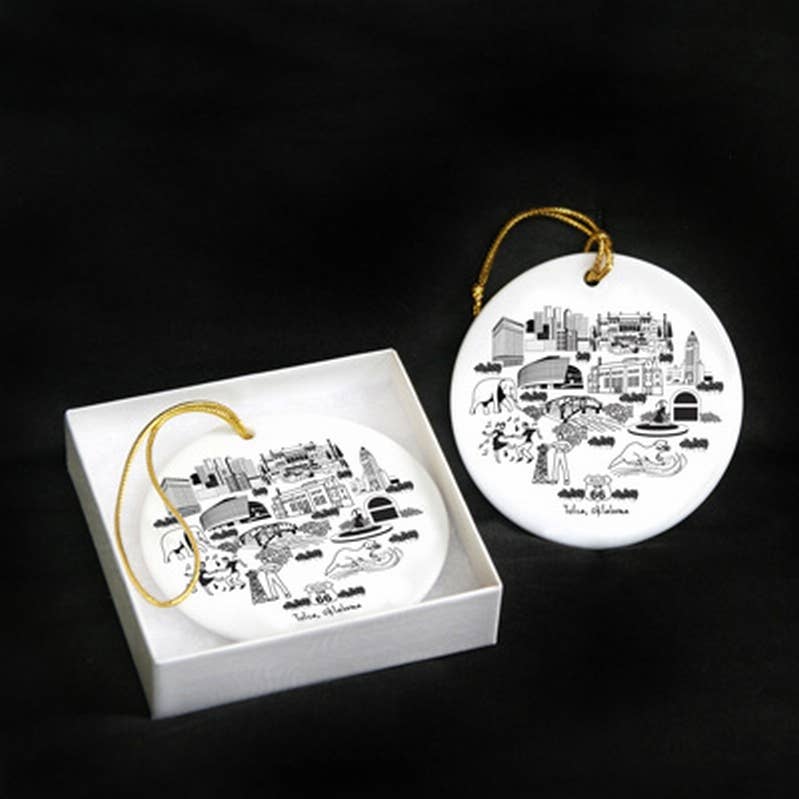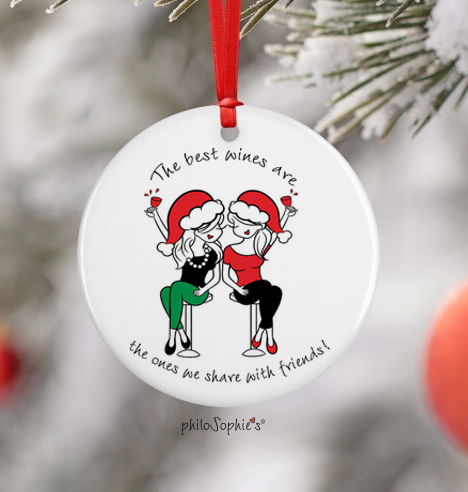 Rond de 3 pouces, conçu et imprimé dans un ornement en porcelaine Rochester NY. avec ruban rouge, emballé individuellement dans un sac blanc en organza avec étiquette cadeau L'illustration de PHoSOPHIs par Joanna Alberti « Je veux vraiment de nouveau des ornements, ce sont de très bons vendeurs ! » ~ Country Store sur Main - Stowe, Vernat