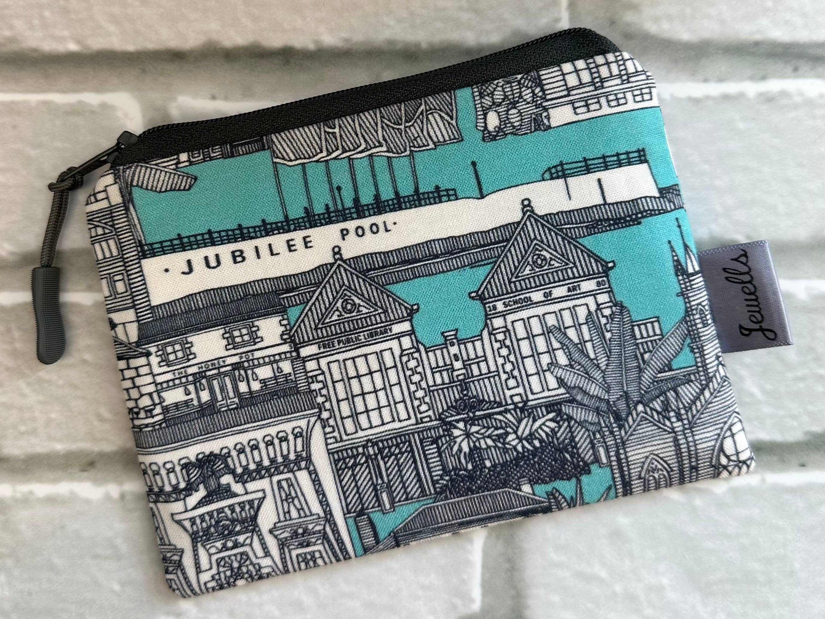 PORTE-MONNAIE EN TISSU Porte-monnaie en tissu avec un fond turquoise et un motif de maquereau sur toute la surface Doublure, fermeture éclair et tirette assorties Mesure environ 15 cm de large - non rembourré Fait main par Jewells