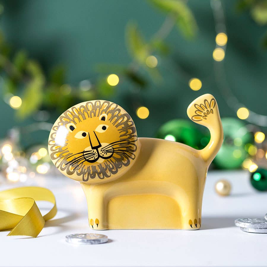 Rugissement ! ! Voici la tirelire Lion, fière, il est là pour chérir vos sous et vos livres. Après votre investissement initial, vous pouvez devenir un penny pincher avec style. Encouragez vos enfants à devenir de super épargnants avec cette élégante tirelire rétro Lion par Hannah Turner, il a un énorme attrait pour les adultes et les enfants, et fait le cadeau parfait. Le style rétro de ce Lion a une sensation très nostalgique et le style graphique comique d'Hannah crée un cadeau de caractère avec des sacs de charme. Il y a une fente à l'arrière pour les centimes ou les livres et un bouchon en caoutchouc dans la base pour les urgences !
