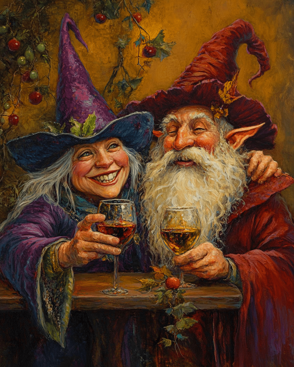 Deux sorciers rient autour de verres de vin - Impressions d'art mural sur le vin – Œuvre 8″x10″ pour cadre 11″x14″ en vente B2B