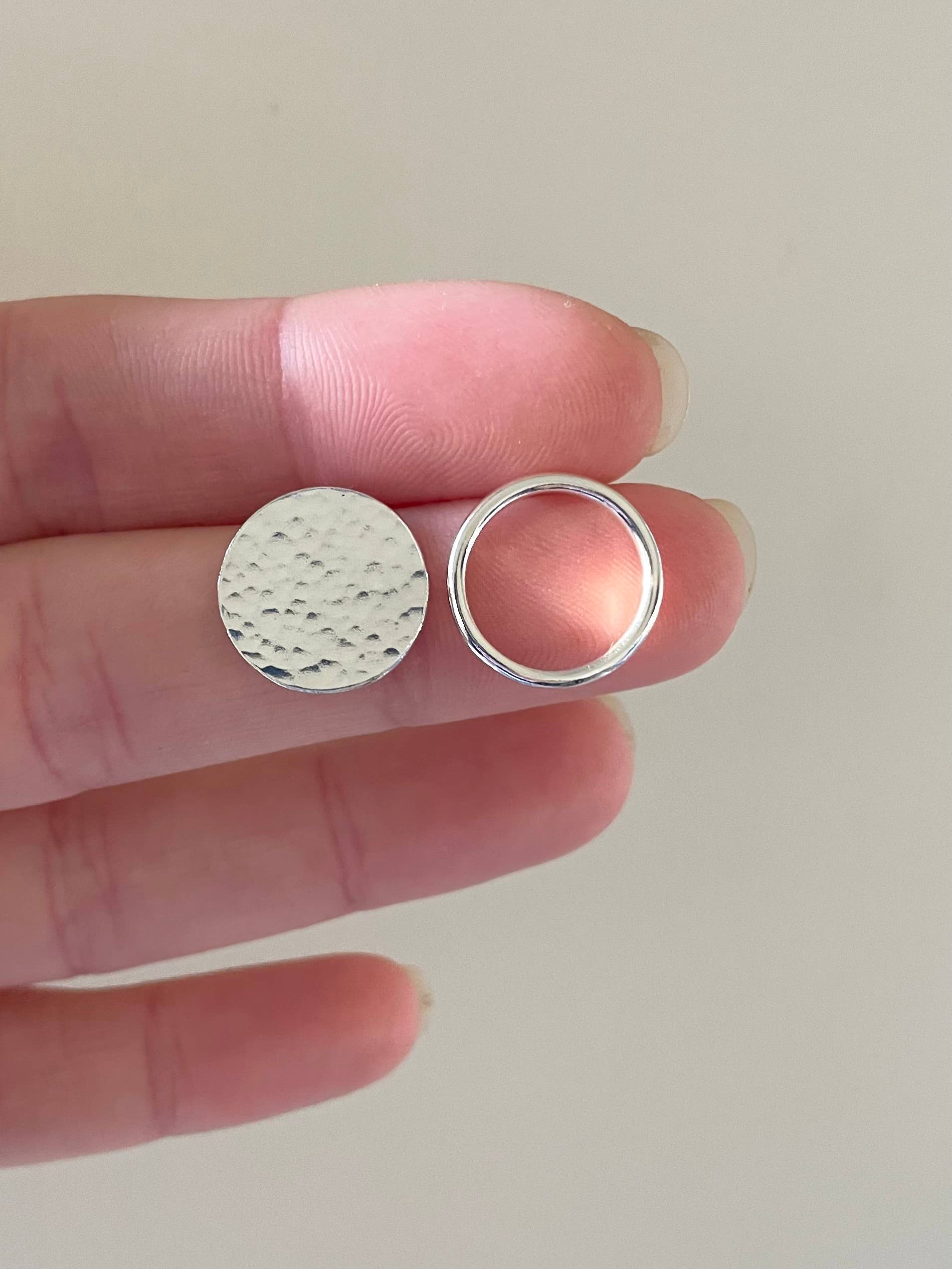 Petites boucles d'oreilles clous rondes en argent, faites à la main avec de l'argent sterling recyclé. Ces petites boucles d'oreilles clous sont formées et texturées en utilisant des techniques traditionnelles de fabrication de bijoux et sont parfaites pour être portées tous les jours. Mesurant environ 5 mm de diamètre, ces clous en argent sterling, petits mais solides, sont ravissants portés seuls pour un look minimaliste, ou dans le cadre d'une pile de boucles d'oreilles moderne pour plusieurs piercings. Envoyées dans une belle boîte de présentation, ces boucles d'oreilles clous minimalistes sont prêtes à la vente.