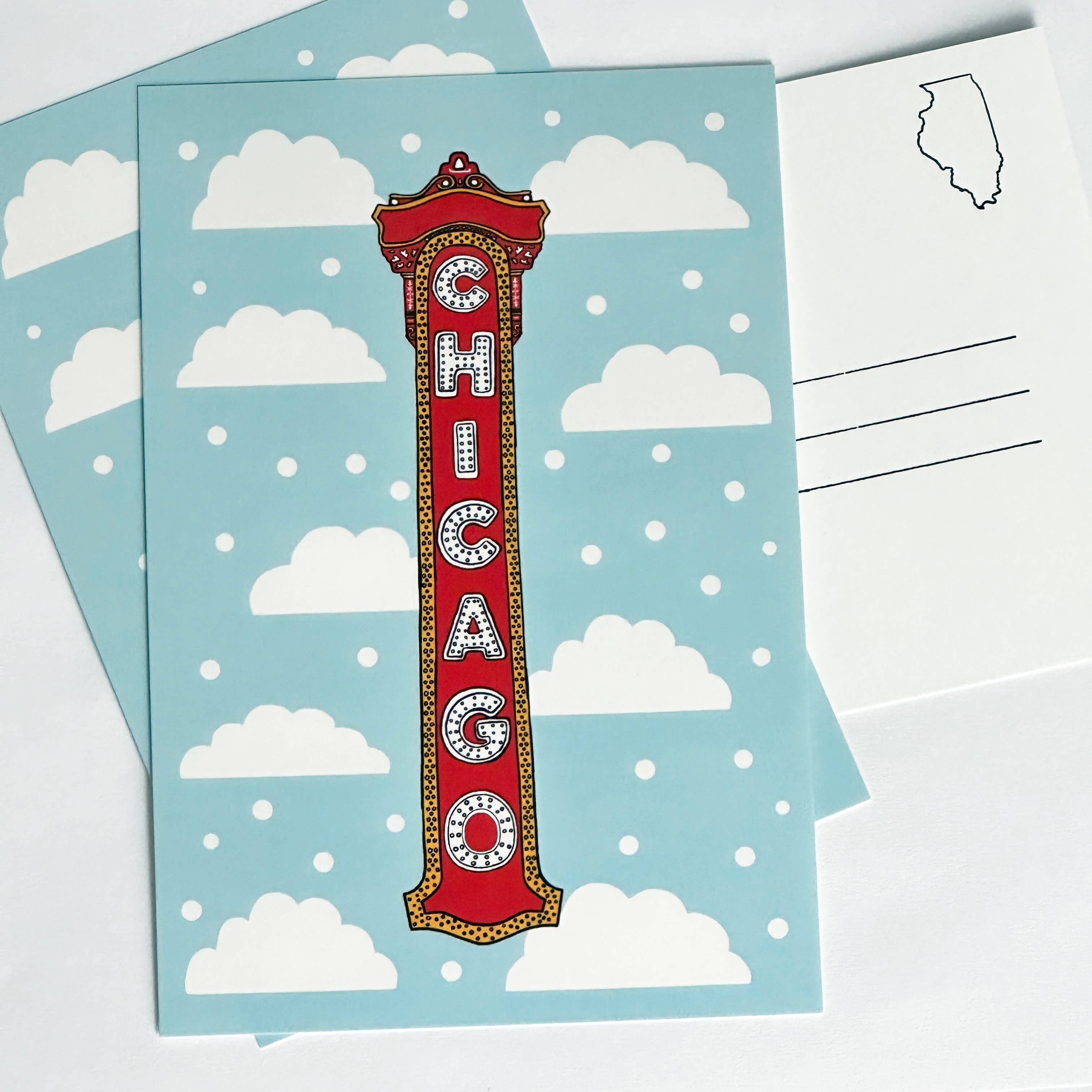 • Carte postale animée dessinée à la main mesure 4 x 6 po • Carte de 18 pts d'épaisseur, finition mate douce et soyeuse, durable et sans brillance • Retour : « Chicago, Illinois - conçu localement par Lettering Works » avec Chicago Flag Star rouge, lettré à la main par Chelsie Tamms avec 4 lignes d'adressage