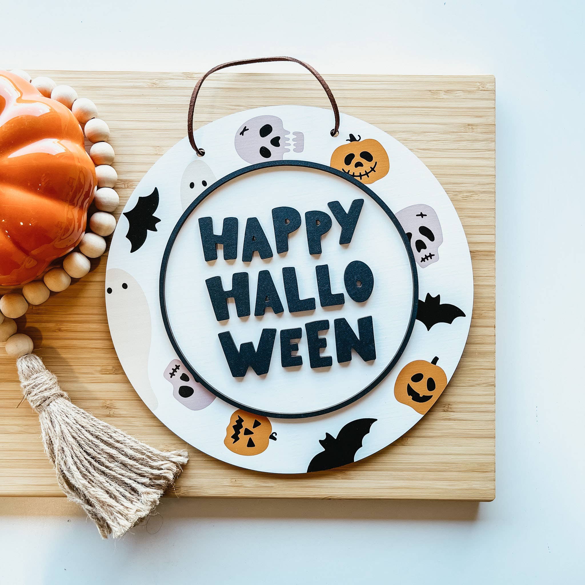 L'enseigne comporte un lettrage 3D surélevé à 1/8 de pouce du panneau arrière ainsi qu'un motif imprimé. Le cercle en acrylique peut être écrit avec n'importe quel marqueur effaçable à sec. Détails : 9 pouces de diamètre. Découpé au laser dans du bois de 1/8 d'épaisseur et s'accroche facilement au cintre en similicuir attaché. Mots-clés : Mini signe, signe d'Halloween, signe d'automne, décoration d'intérieur d'Halloween, décor mignon d'Halloween, signe de citrouille, décor de citrouille