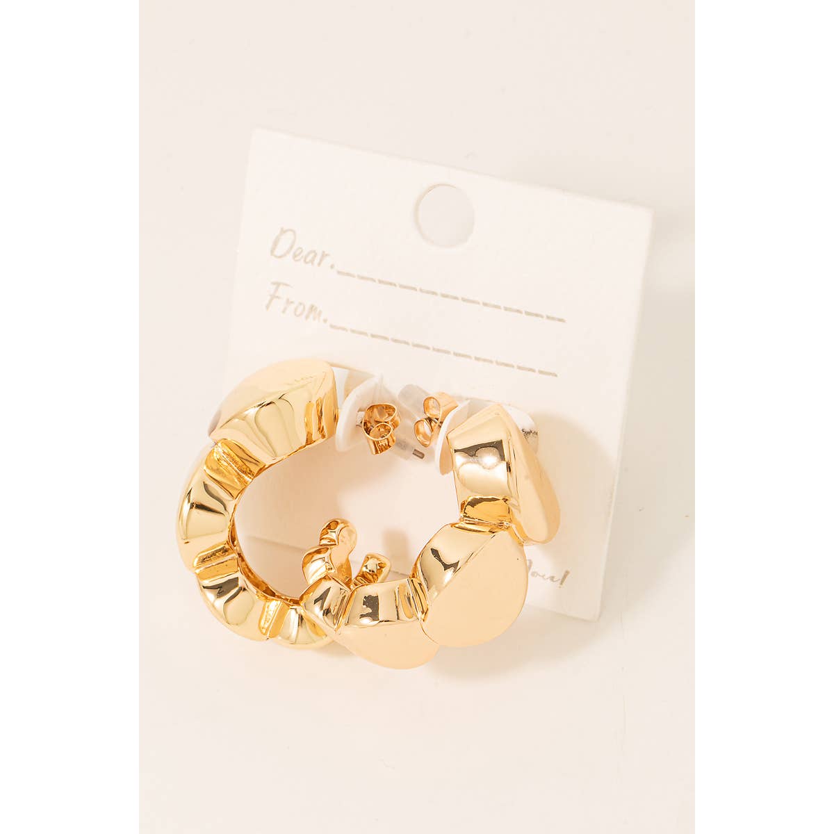 Imprégnez votre boutique d'une touche d'éclat avec nos magnifiques boucles d'oreilles créoles plaquées or 14 carats ! Ces créoles chics allient sophistication et charme, captivant à coup sûr chaque passionné de mode. Que vos clients souhaitent ajouter une touche de glamour à leur tenue quotidienne ou trouver le cadeau parfait, ces boucles d'oreilles créoles sont un ajout essentiel. Détails * Taille de la boucle d'oreille : 1,25" de diamètre * Taille de la carte de support : 2,75" x 3,5" * Plaqué or 14 carats * Acier inoxydable chirurgical * Hypoallergénique * Sans nickel ni plomb * Importé Que ce soit un accessoire pour une fête du Nouvel An, un cadeau pour la journée des Galantines ou un présent pour votre chéri(e), Taylor Elliott a ce qu'il vous faut pour rendre les célébrations de la saison hivernale mémorables !