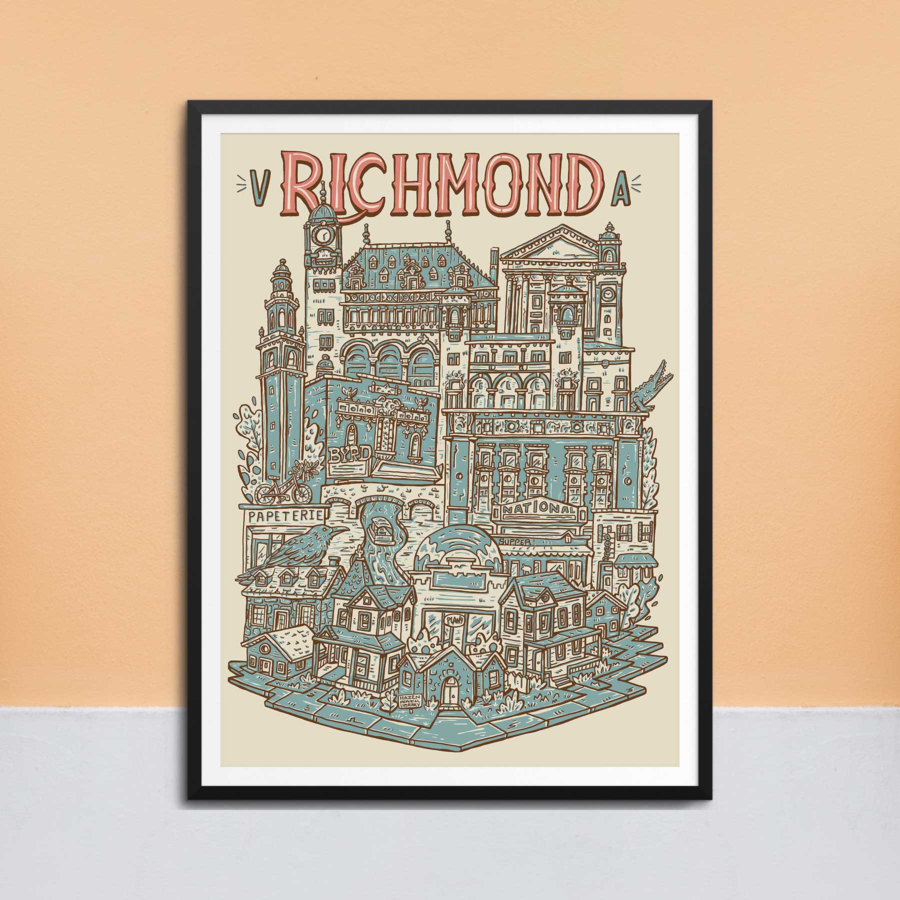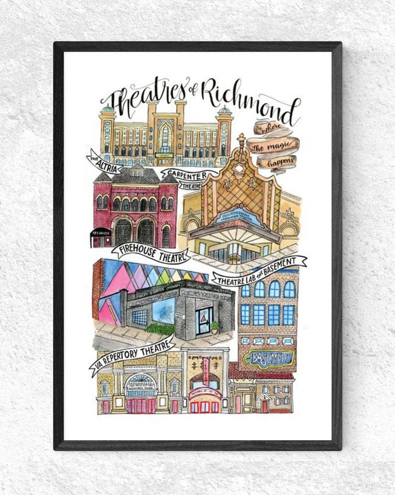 Ce tirage représente les cafés de Richmond, en Virginie, et a été dessiné au crayon, peint à l'aquarelle, puis dessiné à nouveau au stylo plume. L'imprimé présente certains des restaurants les plus distingués, les plus intemporels et les plus sous-estimés de Richmond. Ce tirage comprend Riverbend, Crossroads, Sugar + Twine, Alchemy, Blanchard's, Rostov's, Whisk, Stir Crazy, Chairlift, Blackhand, Ironclad, Sefton, Pomona, Greenbriar, Lamplighter et Lift. Cette impression a une bordure blanche d'environ 1 po, ce qui la rend parfaite pour l'encadrement. Il est imprimé sur du papier mat de qualité poster. J'ai été inspiré de le créer en tant que cinquième d'une série d'illustrations pendant la propagation de la Covid-19. Richmond, en Virginie, est une ville de culture de la restauration et une communauté de petites entreprises uniques. Comme ces restaurants ont tous été touchés par la pandémie, je voulais rendre hommage à leur humilité et à leurs histoires.