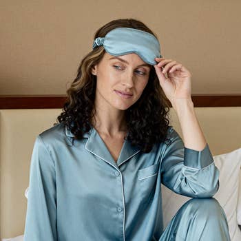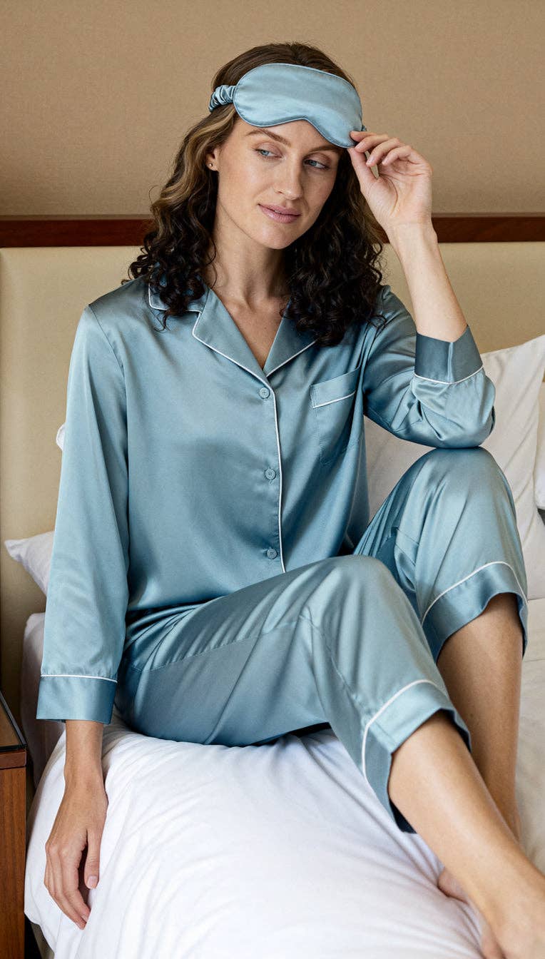 Pyjama de luxe gris ardoise avec un imprimé botanique tropical crépusculaire et sac à cordon assorti.