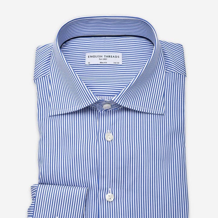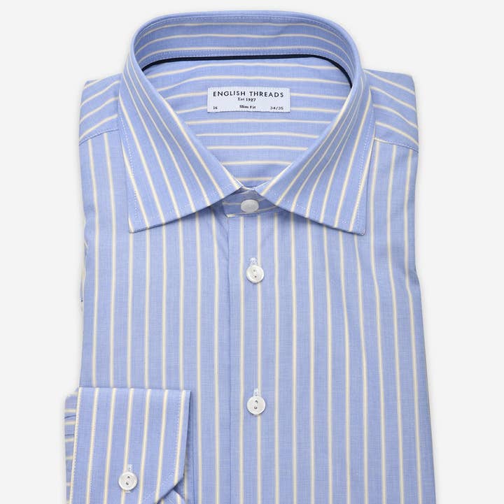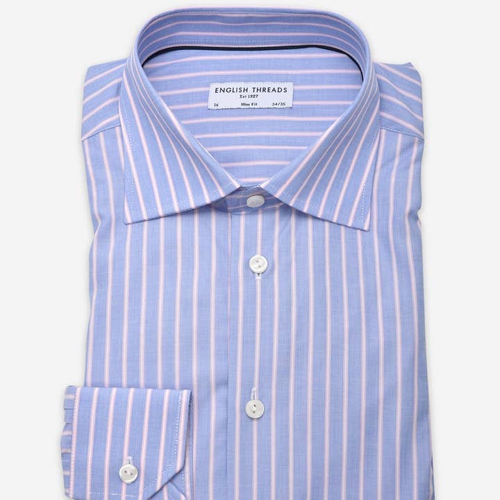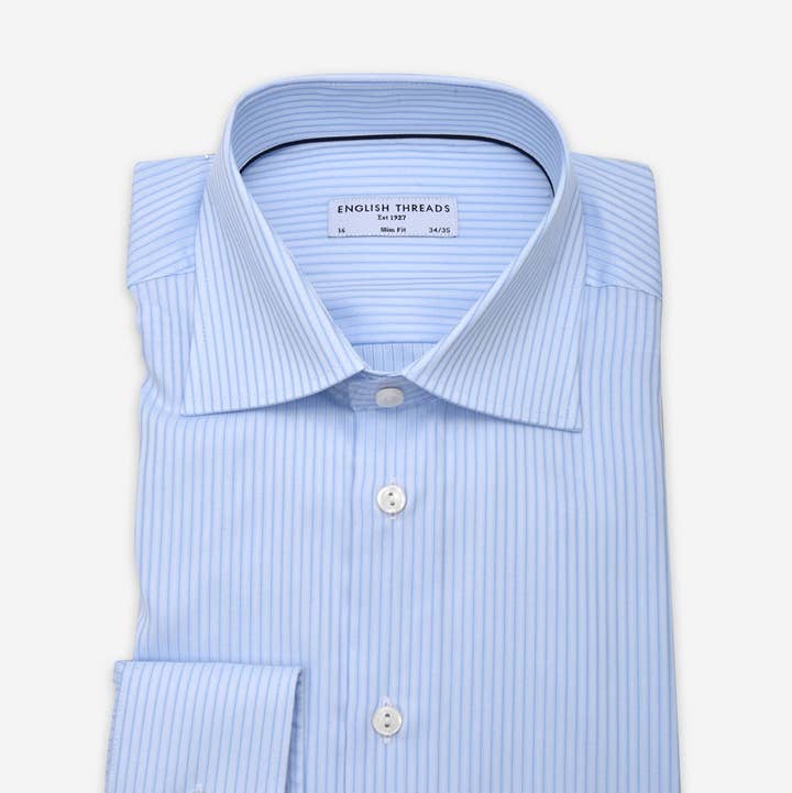 Coupe ajustée. La base est rehaussée à un tissage sergé. Fil filé à un super fin 100 doublé. Pré-rétréci. Col coupé - avec passepoil contrasté. Poignets convertibles - boutons ou boutons de manchette.
