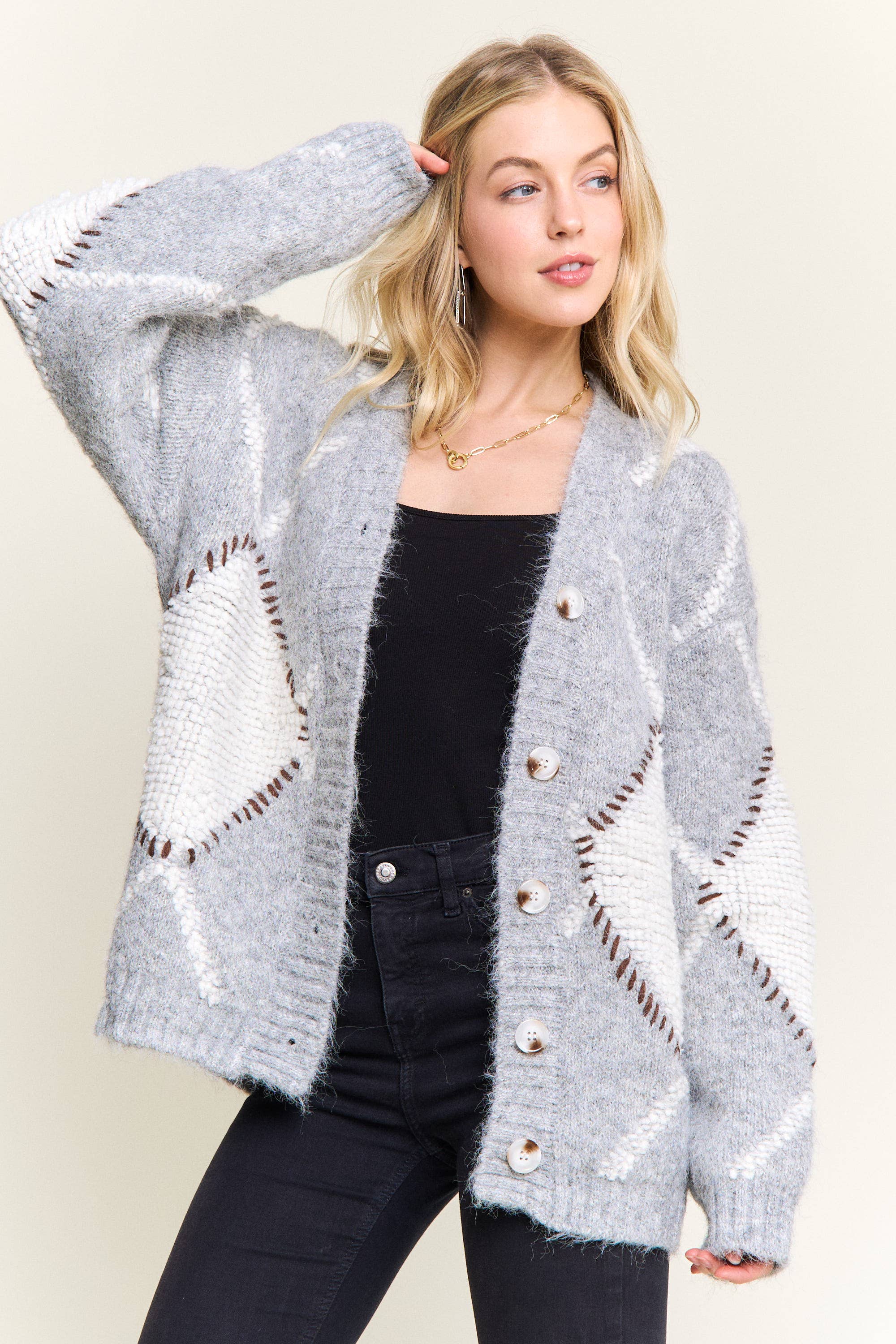 * Style n° : CD8929-4 - Look décontracté vintage avec détails boutonnés à l'avant - Finition tricotée en maille lavée - Coupe ample et décontractée - Le modèle en gris chiné mesure 1,73 m, 81-58-86 cm et porte une taille Small Disponible à partir du NOIR : 21/11/2025 TAUPE : 21/11/2025