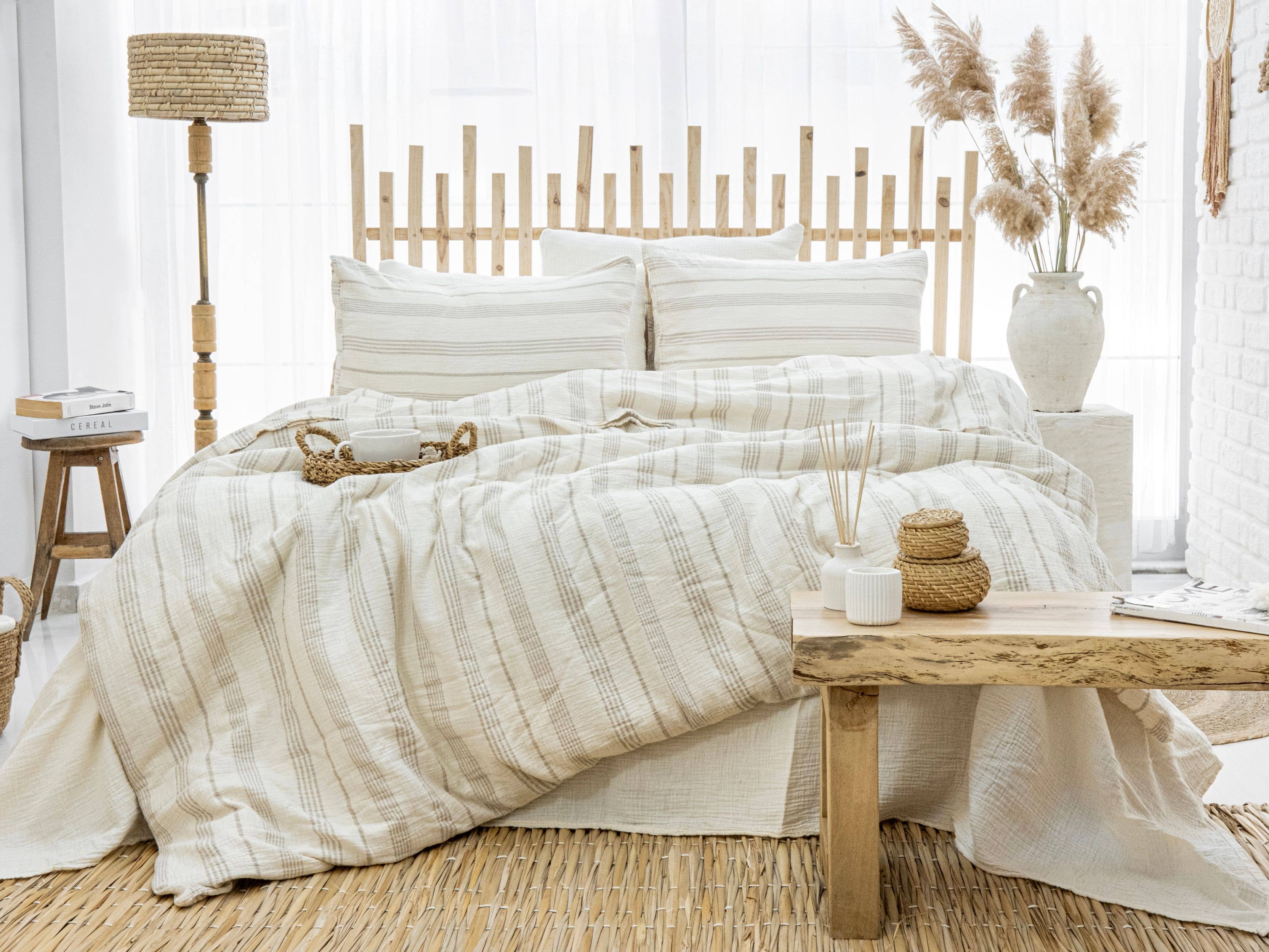 Cette élégante parure de lit marron clair à rayures beiges est fabriquée en 100 % coton. Le tissu doux et luxueux offre un confort et une durabilité supérieurs, parfaits pour une nuit de sommeil paisible. Doté de rayures élégantes pour une touche classique, cet ensemble ajoutera une touche charmante à la décoration de votre chambre à coucher. 2 taies d'oreiller+1 housse de couette Taille queen size : taie d'oreiller 21 pouces x 30 pouces, housse de couette 90 pouces x 95 pouces King size : taie d'oreiller 21 pouces x 36 pouces, housse de couette 106 pouces x 95 pouces Matière : 100 % coton Couleur : rayures marron-beige