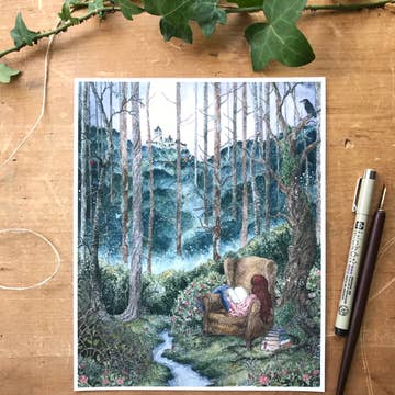 Impression de la peinture acrylique originale, « Secret Treehouse ». Les tirages sont livrés emballés individuellement avec un support en carton aggloméré robuste à l'intérieur d'une pochette de protection, prêts à être placés sur vos étagères. Les informations sur l'artiste se trouvent au dos de l'emballage. Les impressions sont disponibles en dimensions 11 x 14 pouces (moyenne) et 5 pouces x 7 pouces (petite) La quantité minimale est de 10 par design/style.