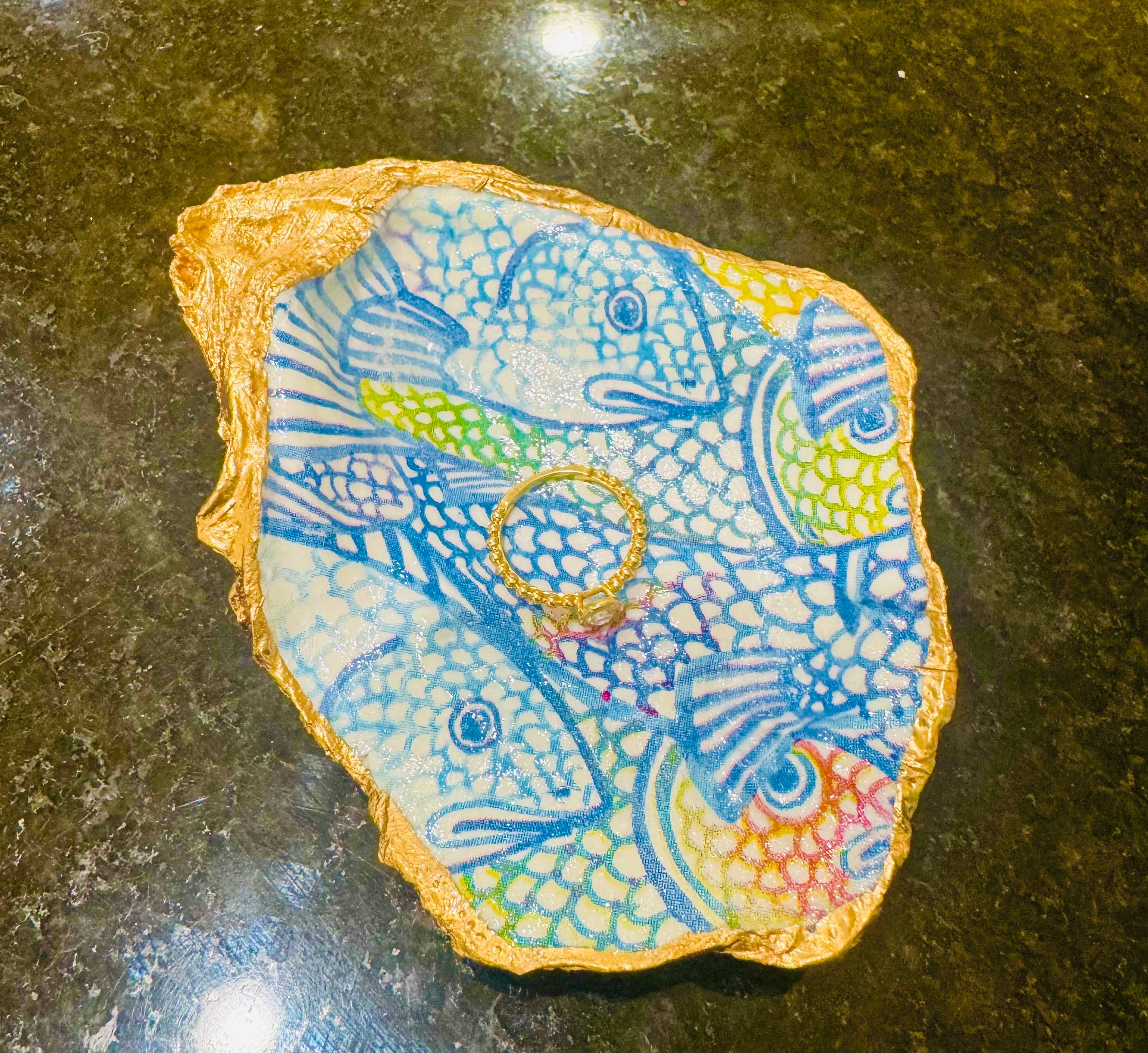 Découvrez un morceau de charme côtier avec ce magnifique grand plat à bagues en coquille d'huître. Mesurant une longueur généreuse de 10 à 13 cm avec une largeur gracieuse de 5 à 8 cm, ces coquilles offrent un espace suffisant pour vos bijoux les plus précieux. Chaque coquille est transformée en une œuvre d'art unique, ornée d'un papillon bleu nuit vibrant délicatement découpé sur sa surface, créant un visuel captivant. Le bord naturel est doré à la main avec une peinture à la feuille d'or liquide scintillante, ajoutant une touche de détail luxueux et d'élégance côtière. Une finition brillante protectrice scelle l'ensemble de la coquille, garantissant une beauté et une durabilité durables. Ces plats sont parfaits comme porte-bagues dédié sur votre table de chevet ou coiffeuse, un joli plat à bibelots pour de petits trésors, ou simplement comme une pièce de décoration côtière saisissante pour rehausser n'importe quelle pièce.