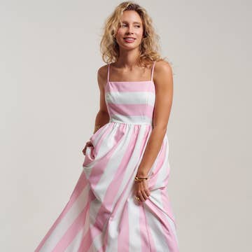 Robe longue à bretelles en lin rose à rayures pour femmes