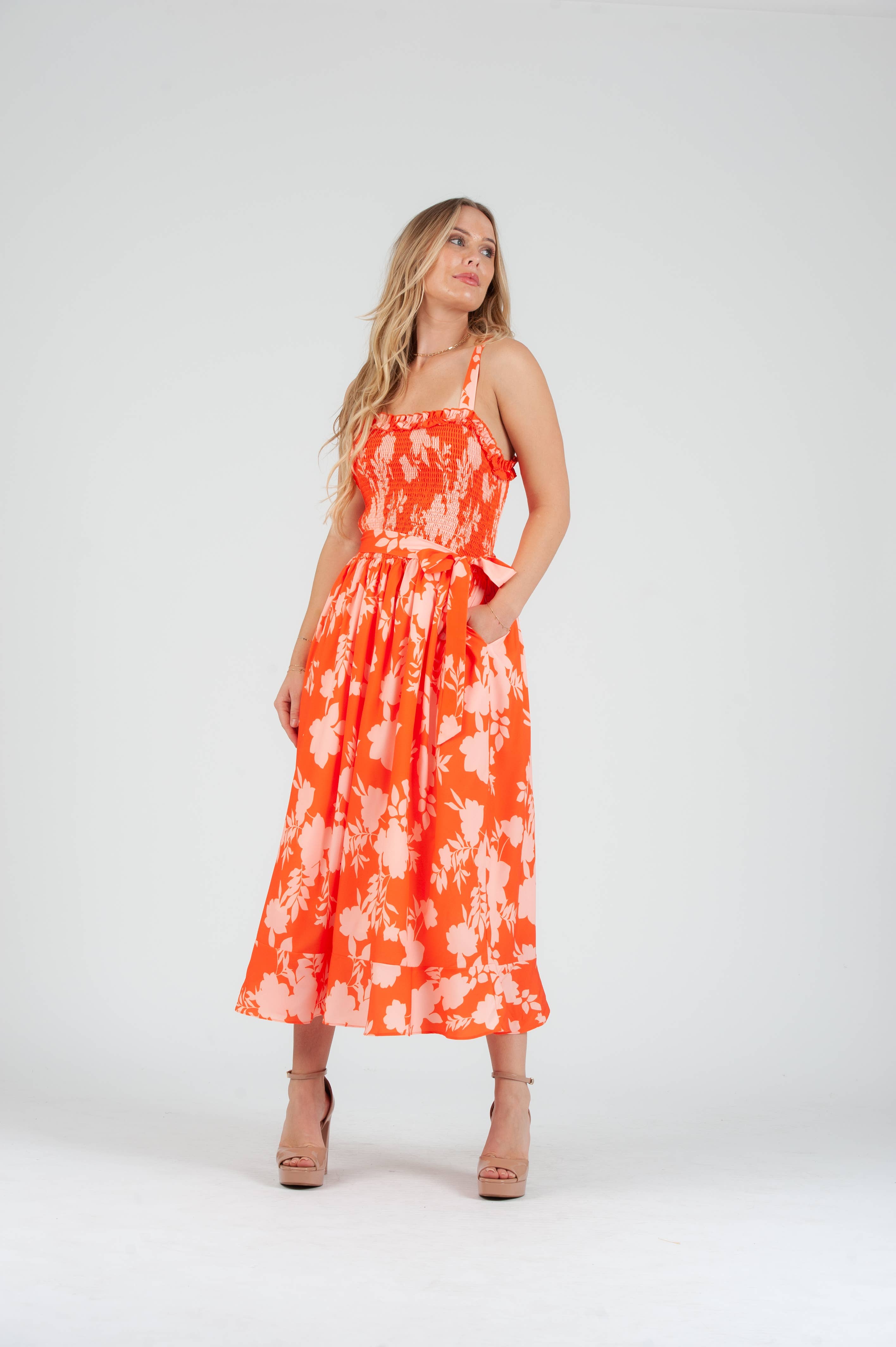 Robe longue à bretelles en lin rose à rayures pour femmes en vente B2B