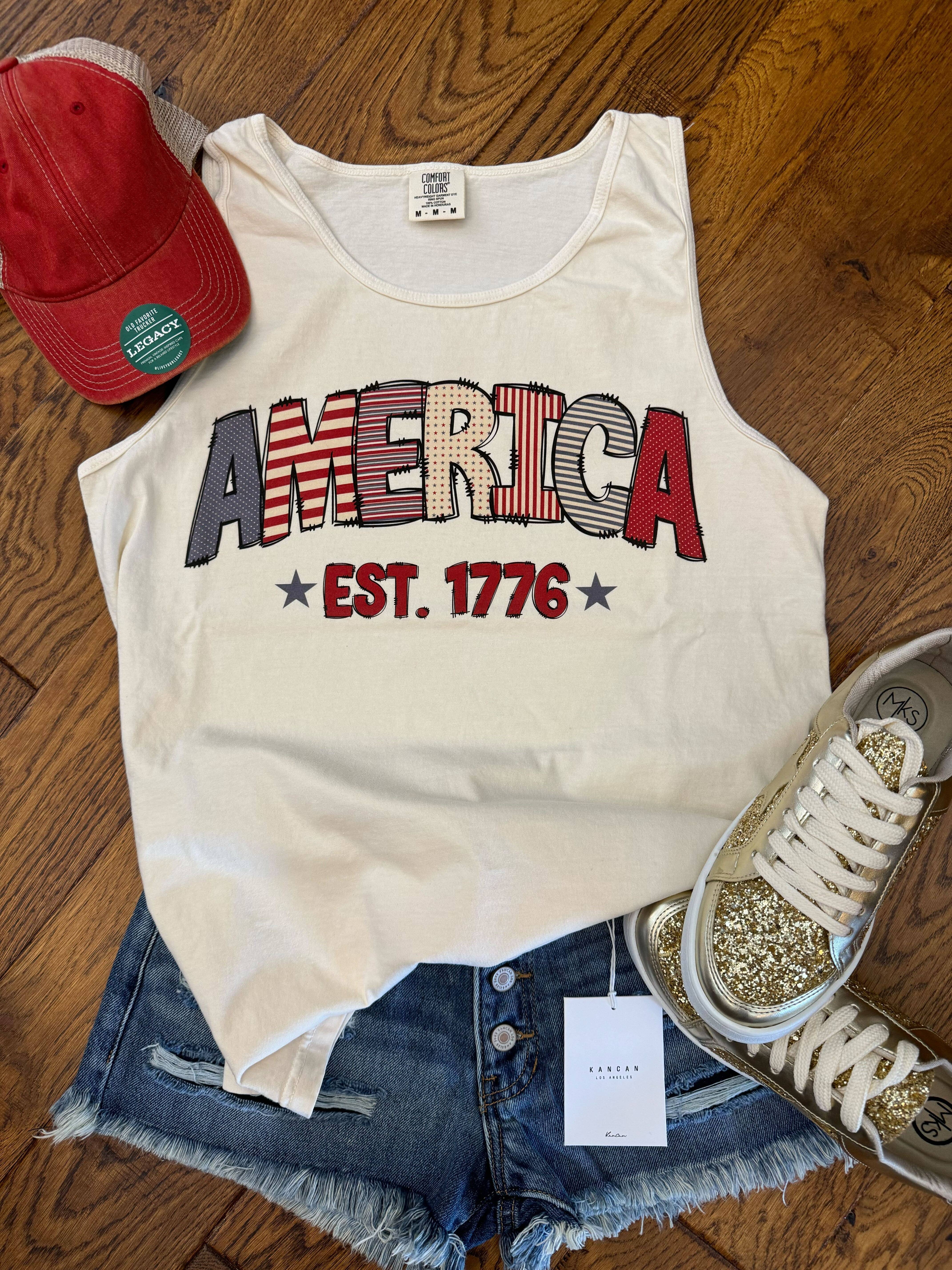 Débardeur graphique 100 % coton avec un look vintage authentique et une sensation plus douce rendue possible grâce à nos enzymes spéciales pour les processus de teinture et de lavage minéral. - Prérétréci - Instructions de lavage : - Lavage à l'eau froide recommandé - Pas de javel et de préférence avec des couleurs similaires - Séchage en machine à basse température - Le modèle porte une taille Small (LONGUEUR : 26,5" / BUSTE : 34") Teinture de vêtement graphique et tee-shirt. T-shirts sérigraphiés T-SHIRTS, CHEMISE, TEE-SHIRT GRAPHIQUE, DÉBARDEUR, AMÉRIQUE, 4 JUILLET