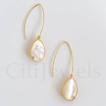 Boucles d'oreilles pendantes en bronze doré à l'or 14 carats avec tiges en vermeil doré et perle d'eau douce Les boucles d'oreilles mesurent 35 mm x 11 mm La forme et la taille des perles peuvent varier Vendu par paire Fabriqué à Vancouver, au Canada.