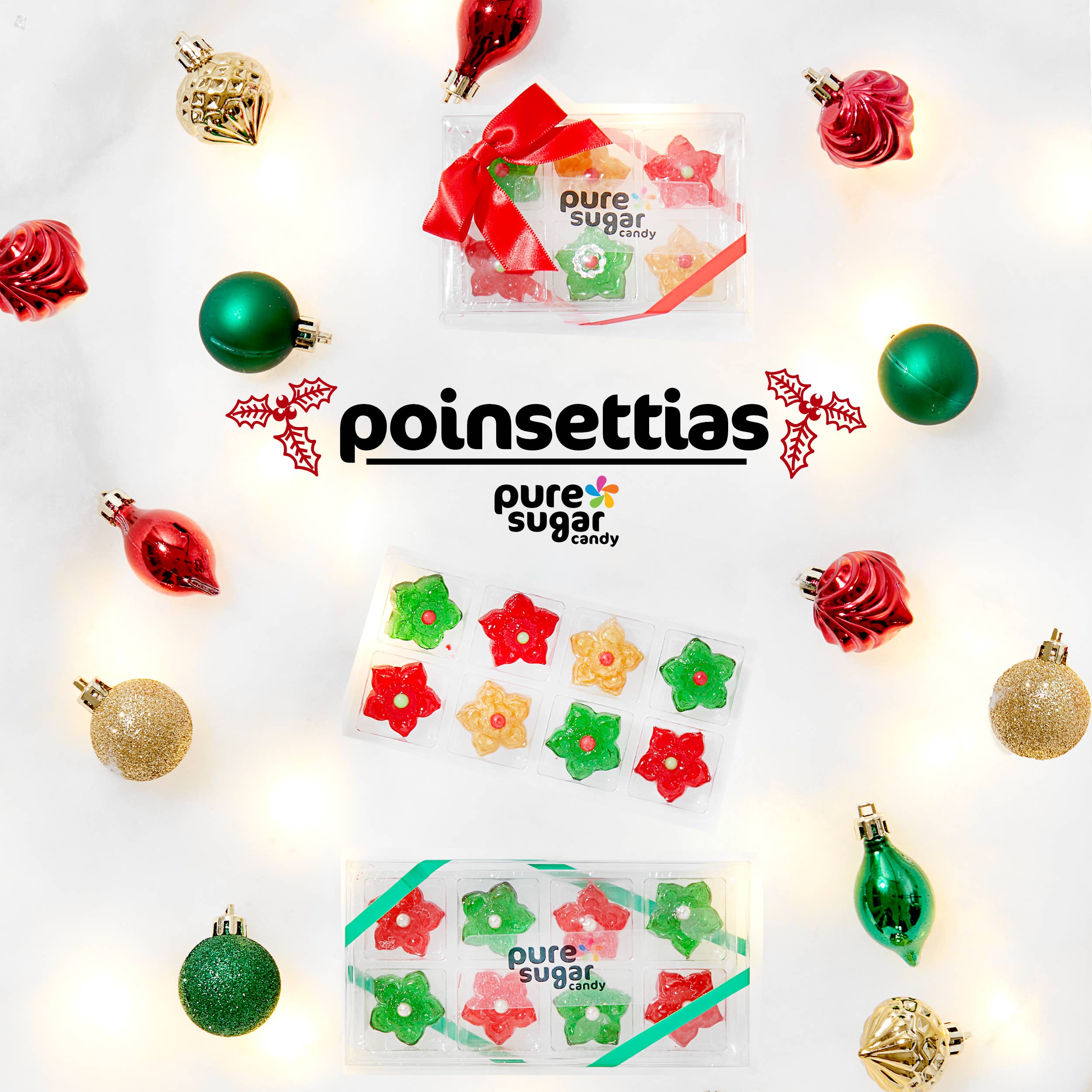 Ces arbres sont nos meilleurs vendeurs pour les fêtes de fin d'année. Ils mesurent environ 4 pouces de haut. Ils ressemblent à du verre soufflé, mais ils sont 100 % comestibles et délicieux ! Ils se déclinent en trois saveurs fabuleuses, pomme verte, cerise et pâte à gâteau. Ils arriveront dans un magnifique emballage en tube transparent de forme hexagonale, tous habillés d'un nœud de couleur coordonnée et d'un maillet en bois pour ouvrir le sapin et en profiter !