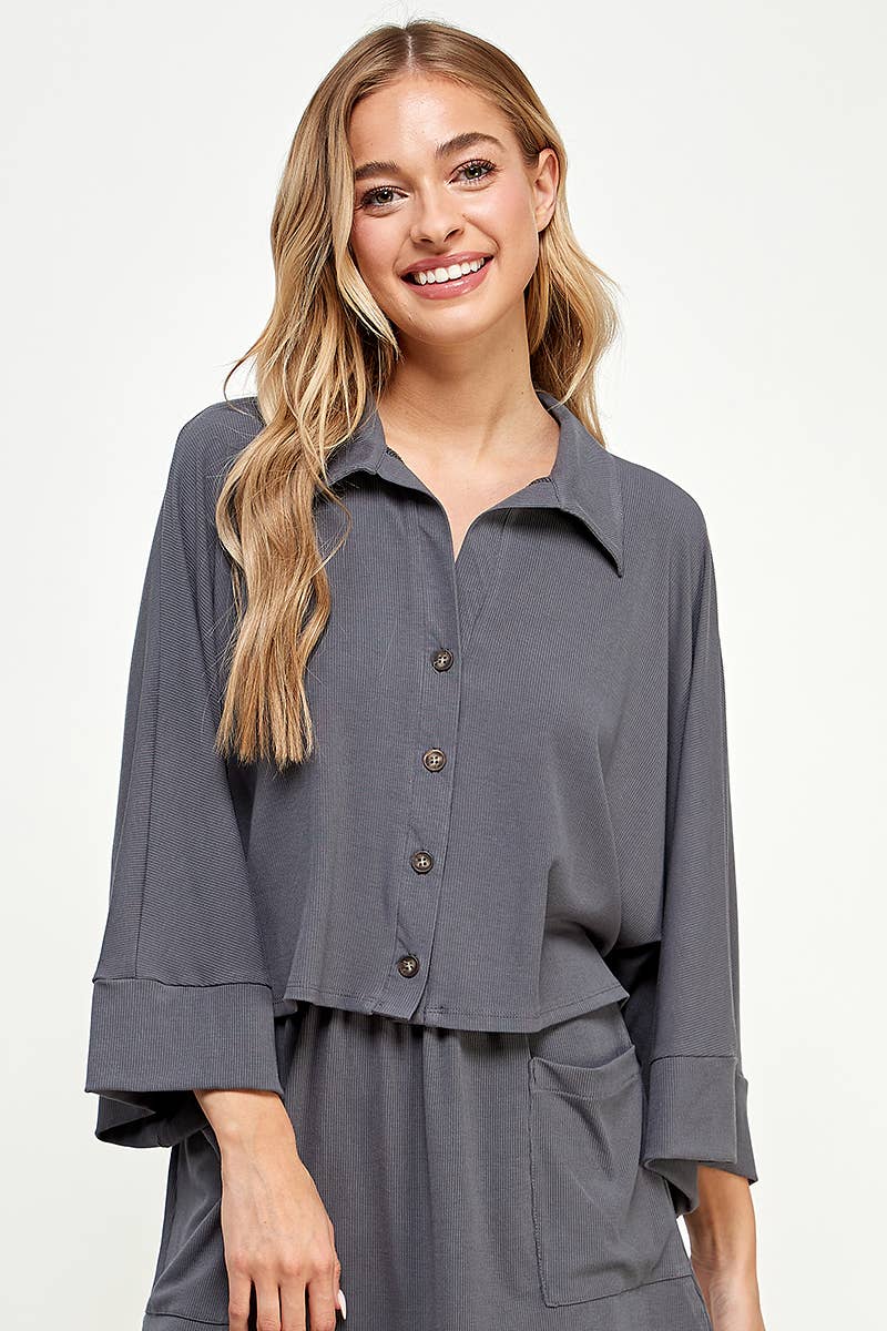 Chemise boutonnée tissée à texture facile avec poches. Taille du corps : contemporain Motif : solide Longueur : manches longues Style : bouton enfoncé Tissu : rayonne