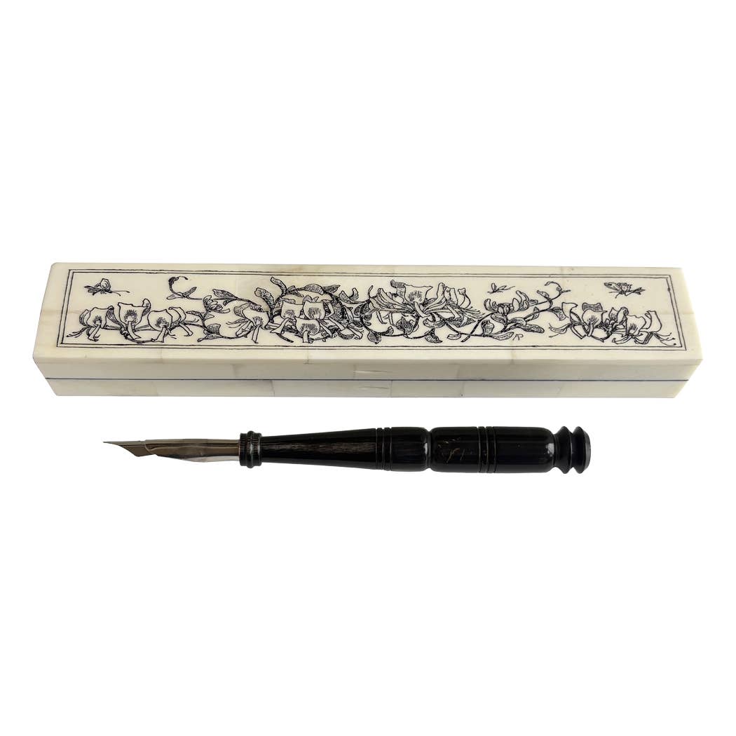 Ces stylos à tremper exquis et parfaitement équilibrés proviennent de France. Moulés à la main en étain massif, ils se réchauffent au toucher lorsque vous écrivez, devenant ainsi une extension presque organique de votre main. Pendant que l'écrivain est au repos, ils constituent une décoration raffinée pour n'importe quel bureau, placés sur de simples porte-stylos. Développant une riche patine au fil du temps, devenant impossible à distinguer de leurs ancêtres des XVIIe et XIXe siècles. Disponibles dans de nombreux motifs, de la fleur de lys classique aux grains de café ludiques, ces reproductions anciennes de qualité ancienne inspirent les calligraphes professionnels comme les novices. Potier d'Etain est une famille d'étain français de 5e génération. Spécialisés dans l'étain moulé à la main à l'aide de moules vintage très détaillés, ils créent des accessoires de bureau de reproduction anciens exceptionnels. Papier Plume est le distributeur nord-américain exclusif de Potier d'Etain.