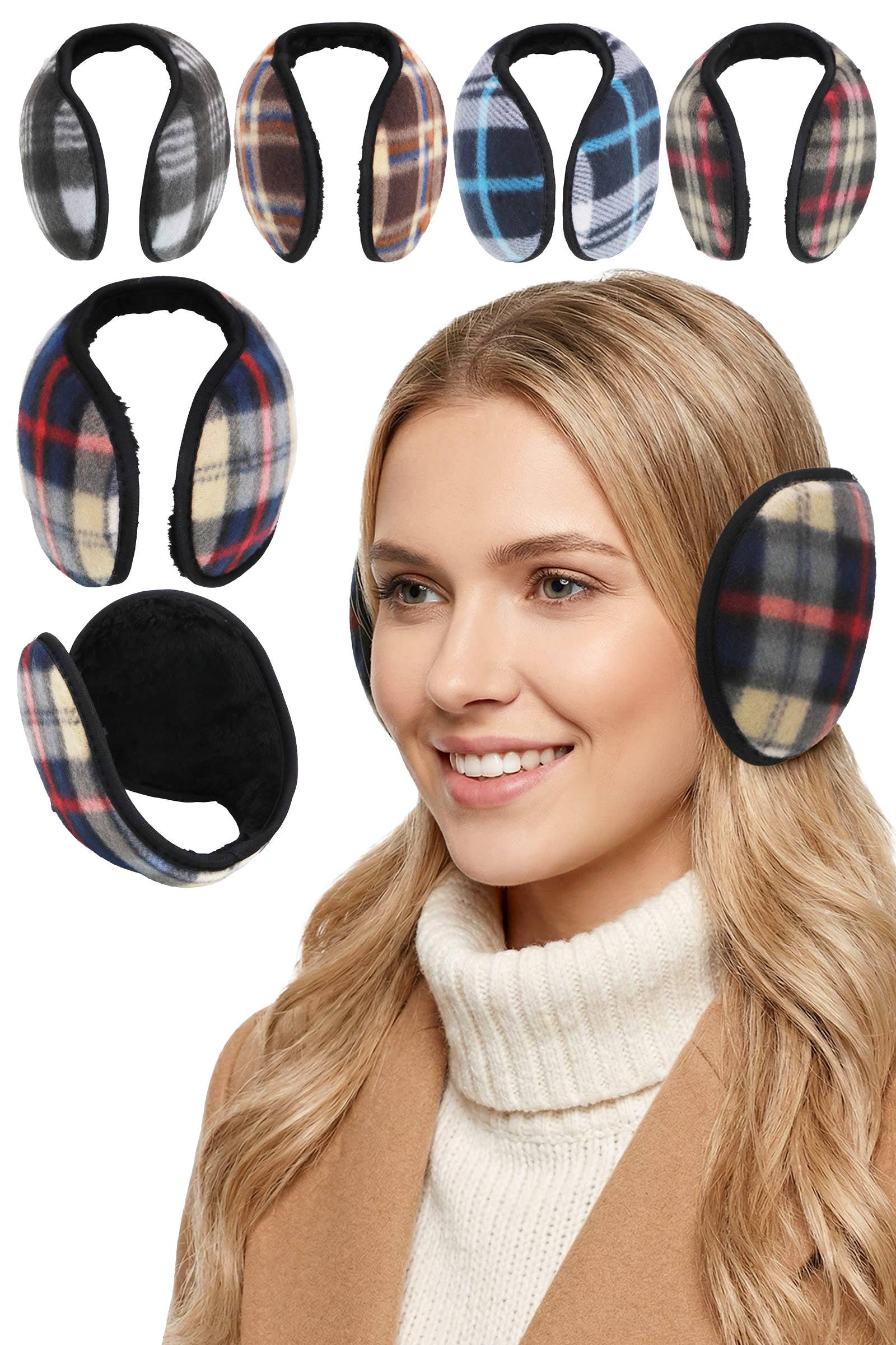 Bandeau cache-oreilles en laine tricotée doublé polaire avec chaîne de marguerites bleues en vente B2B