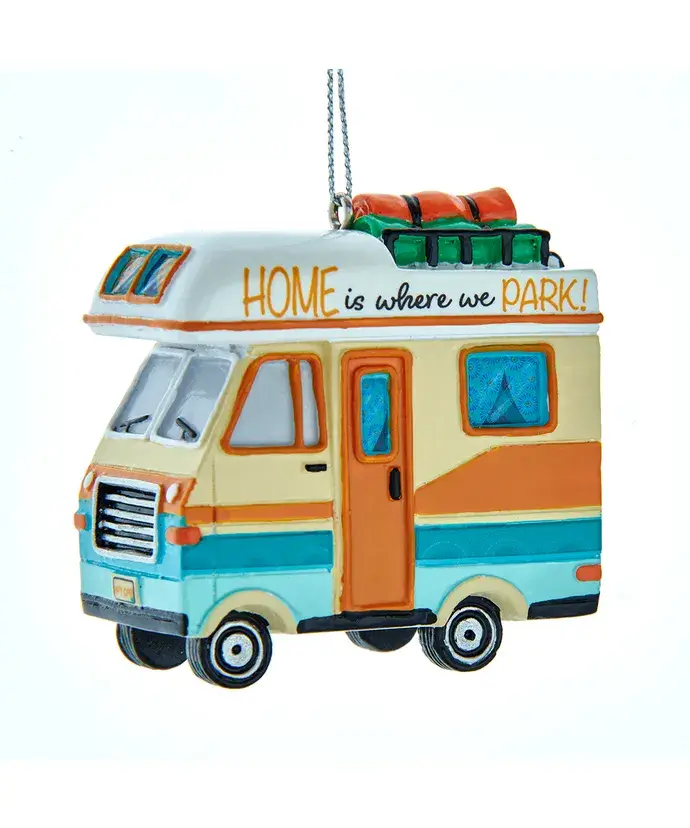 Cette décoration de camping en verre de Kurt Adler est le complément parfait à votre décoration d'intérieur ou de vacances. Cette décoration représente un camping-car rouge et blanc avec une couronne de guirlandes vertes, un nœud rouge et une guirlande de lumières de Noël multicolores.