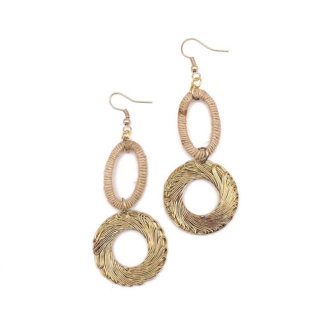 Le motif lever de soleil en laiton est rehaussé de perles de verre colorées. Hauteur 11,4 cm, largeur 1,8 cm. Ces boucles d’oreilles sont fabriquées à la main dans un atelier de commerce équitable au Guatemala.