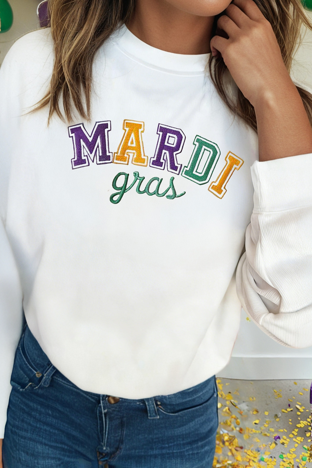 Ce pull French Terry pour adulte est confectionné avec des paillettes festives pour créer un motif « MARDI MARDI MARDI GRAS » accrocheur. Parfait pour votre prochaine célébration de Mardi Gras, ce pull vous permettra de vous démarquer de la foule. Tailles allant du XS au 3XL !
