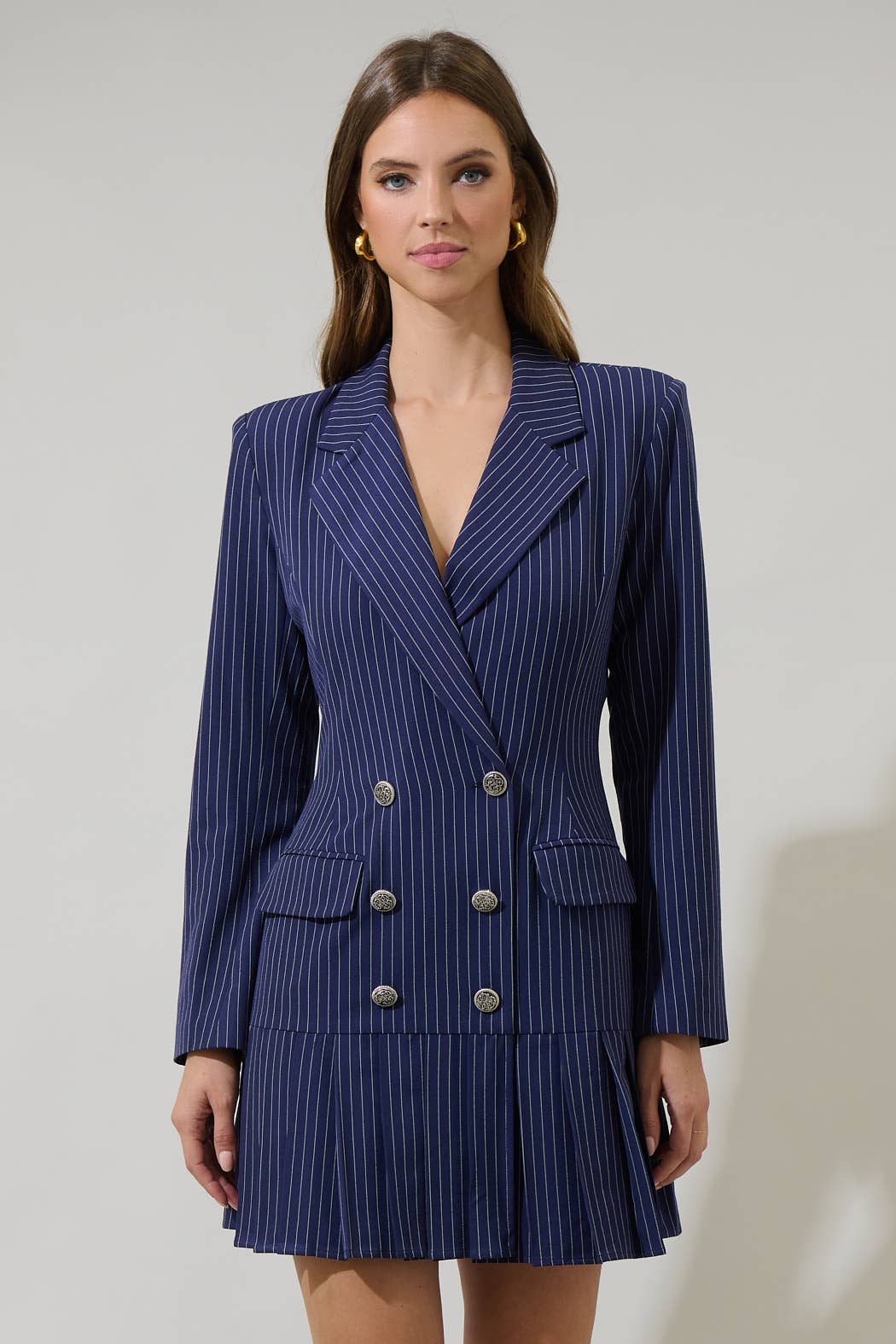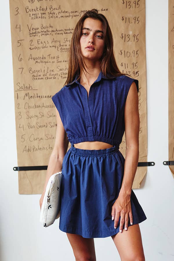 Robe blazer sans manches bleu marine foncé. La robe présente un design à double boutonnage avec de grands boutons sur le devant et une coupe ajustée et structurée. Le détail remarquable de la tenue réside dans les manches volantées exagérées fabriquées dans un tissu plus léger et contrastant, probablement du denim, qui ajoutent une touche unique et audacieuse au look. La robe blazer est courte et se termine juste au-dessus des cuisses, et elle crée une apparence sophistiquée mais avant-gardiste.