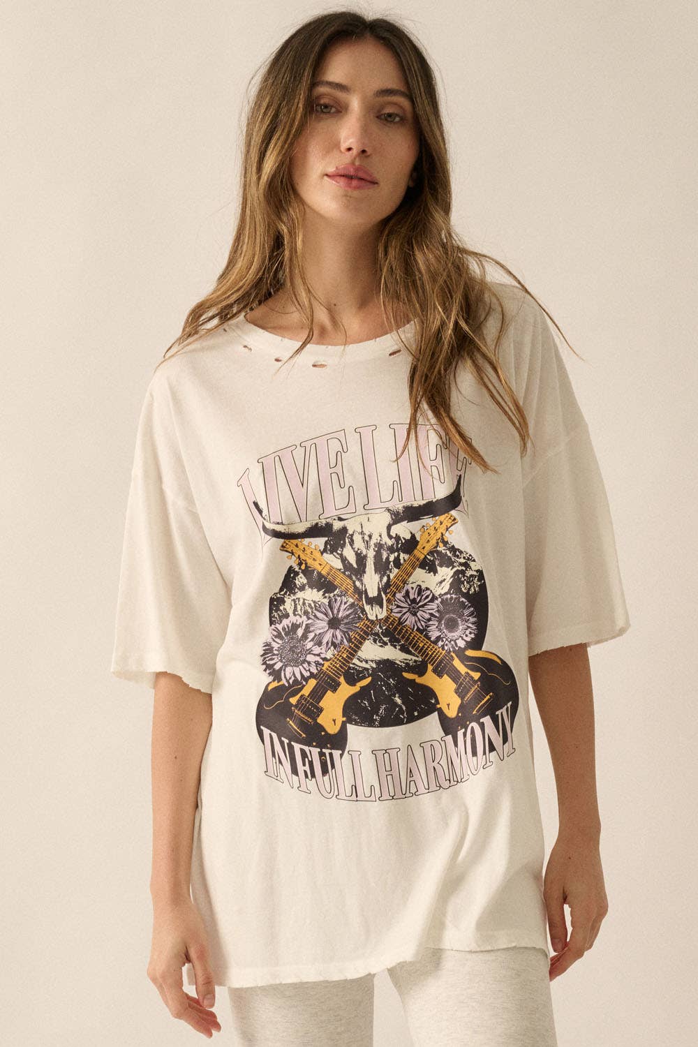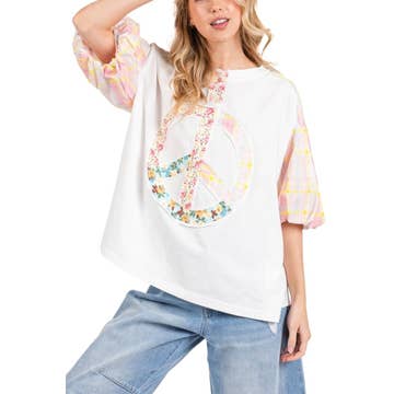 - TISSU TRICOTÉ EN COTON - PATCH À IMPRIMÉ FLORAL EN FORME DE SIGNE DE PAIX - MANCHES RAGLAN 3/4 À BLOCS DE COULEURS - LAVIS MINÉRAL - HAUT À COUPE AMPLE LE MANNEQUIN MESURE 1,80 M ET PORTE UNE TAILLE S printemps, été, décontracté, graphique, imprimé floral, surdimensionné, surdimensionné, délavé, colorblock, baseball, trois-quarts, manches courtes, contrasté