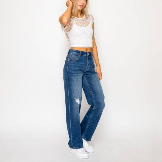 JEAN DROIT TAILLE HAUTE LAVAGE FONCÉ EXTENSIBLE CONFORT FERMETURE ÉCLAIR NON DÉCHIRÉ ORNEMENT EN STRASS À L'AVANT TAILLE 10,5" ENTREJAMBE 29" EN TAILLE 5/26 99% COTON 1% ÉLASTHANNE 12,2 OZ