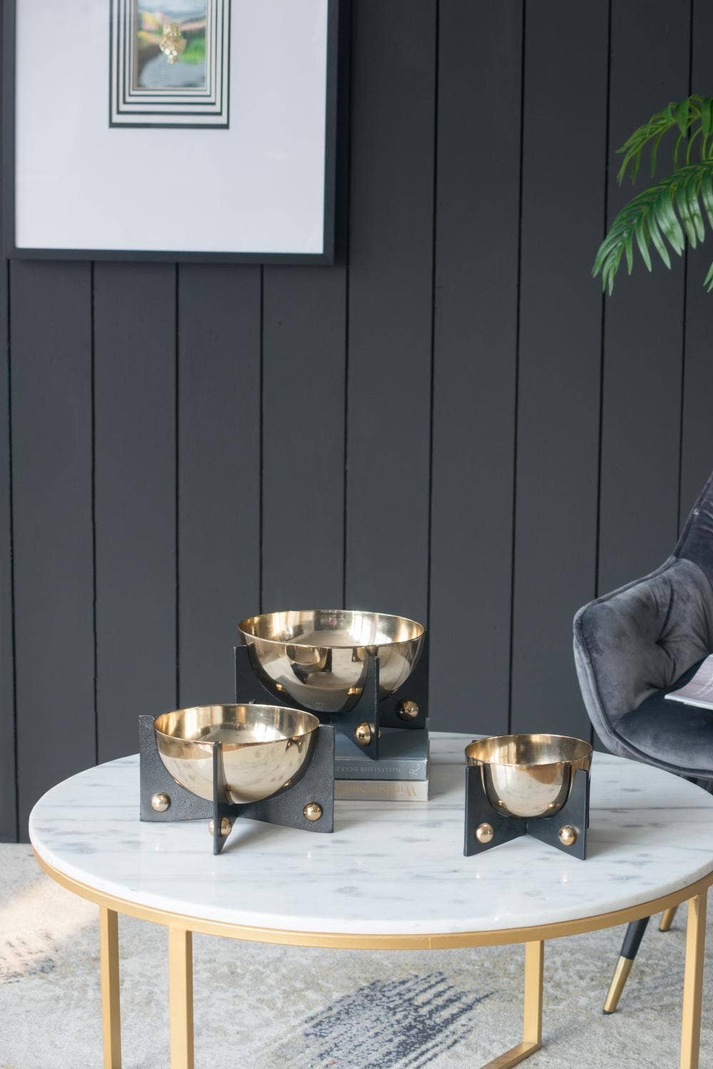 Ce groupe de trois bols prend un aspect complètement différent en raison de l'application opposée des finitions noir et laiton présentées en alternance, mais côte à côte. Visuellement intéressants et parfaits en échelle et en taille, ces bols sont des récipients chics pour contenir toutes sortes de belles sphères ou de fruits frais ou même une combinaison des deux.
