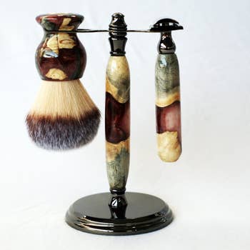 Il s'agit d'un ensemble de rasage en bois de cerf fait à la main de qualité supérieure, comprenant un rasoir, un blaireau et un support en chrome. Ce rasoir s'adaptera naturellement à votre main tout en vous offrant une expérience de rasage agréable. Vous avez le choix entre quatre styles de tête différents (lame non incluse) : • Fusion • Gillette Mach 3 • Sécurité Le blaireau est fabriqué à partir d'un mélange de haute qualité de poils de blaireau naturels. Ce blaireau offre une sensation plus douce sur votre visage, similaire à celle des blaireaux rares et beaucoup plus chers. Il est densément garni et offre une rétention d'eau supérieure, ce qui permet une excellente action moussante et une application de mousse épaisse sur votre visage. Ces poils ont moins tendance à se plier, ce qui est souhaitable en raison de l'action de gommage très efficace que vous pouvez effectuer sur votre savon à raser, ainsi que sur votre visage. Ce support plaqué chrome a une base solide et robuste et un cintre pour les poignées.