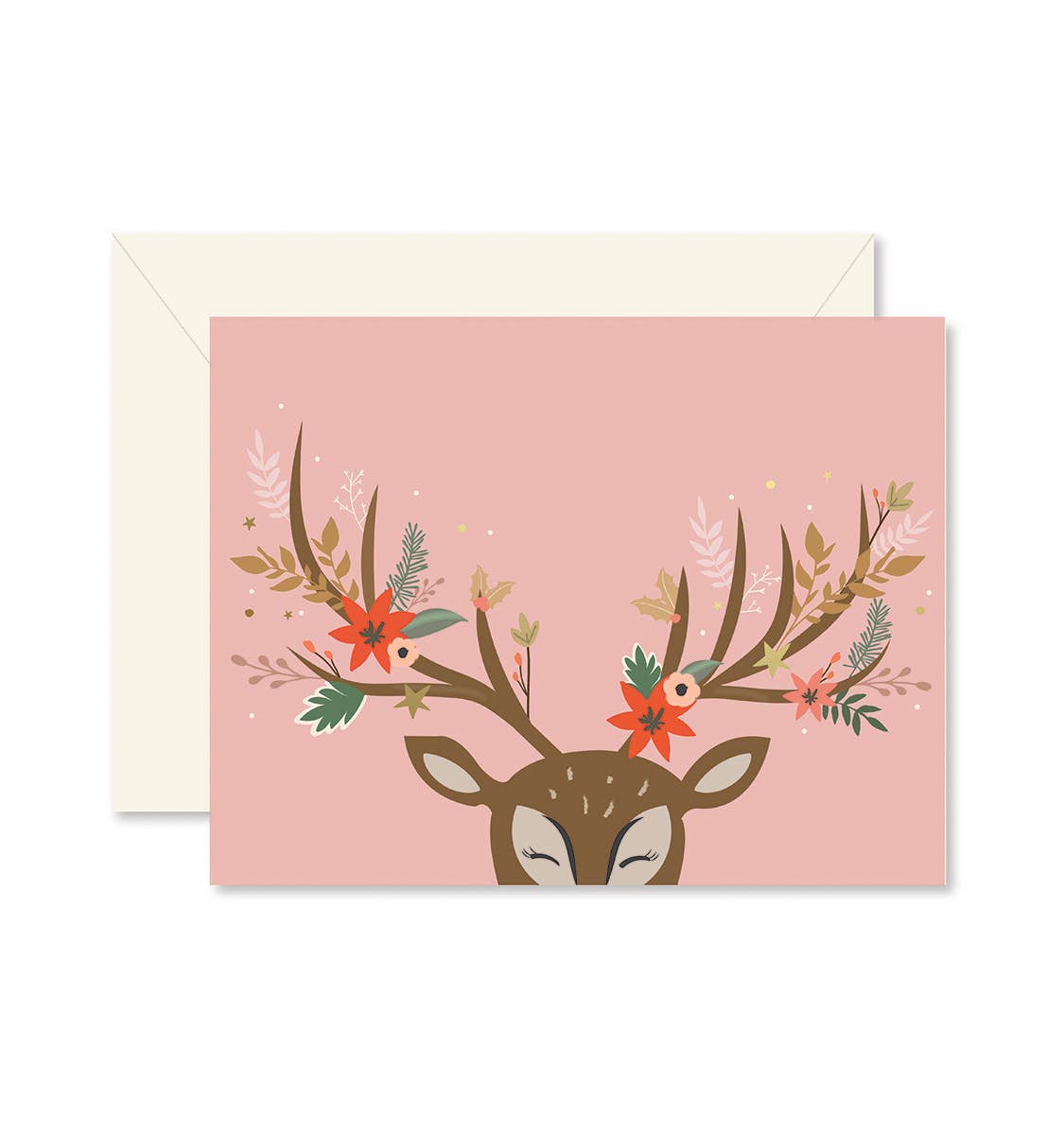 Carte de vacances A2 Carte de vœux de 4,25 pouces x 5,5 pouces en papier de couleur crème avec enveloppe assortie dans une pochette en cellophane. Conçu et imprimé à Portland OR sur une presse Indigo aux riches couleurs saturées. Notre imprimeur local utilise du papier partiellement recyclé, de l'encre de soja et des pratiques respectueuses de l'environnement. Souris cerf avec créatures des bois de gui